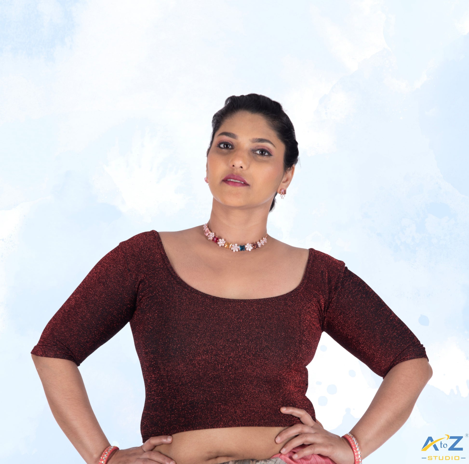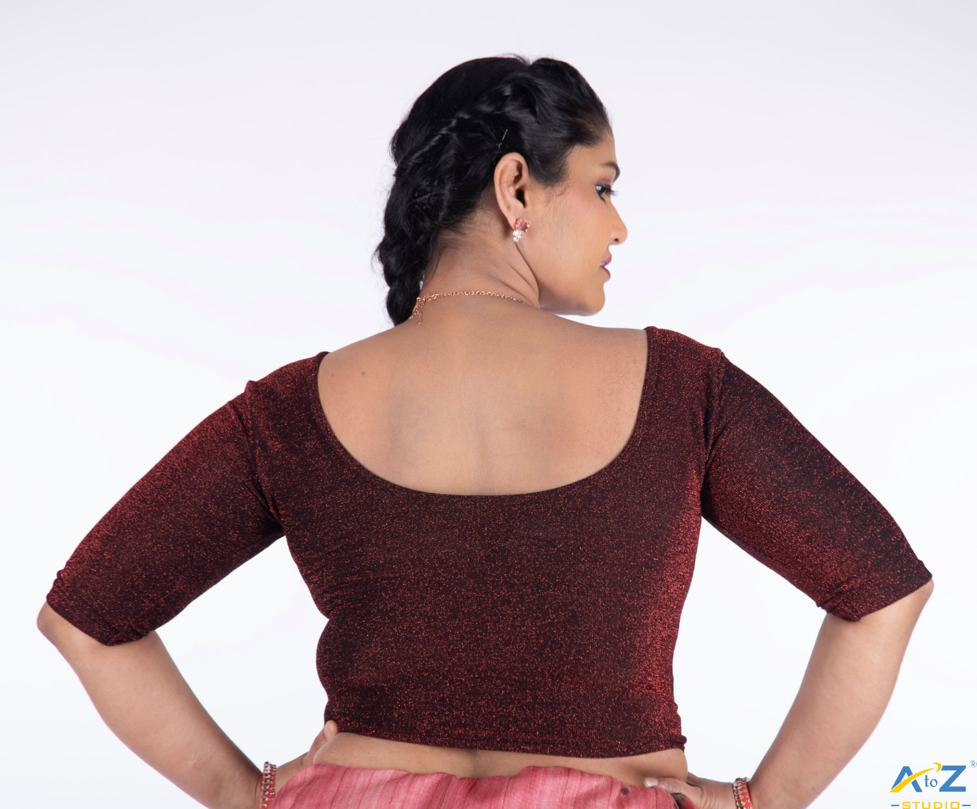 Maroon Metallic Lycra defines elegance in this blouse with shiny round neck, stylish elbow sleeves, and a sleek metallic finish.