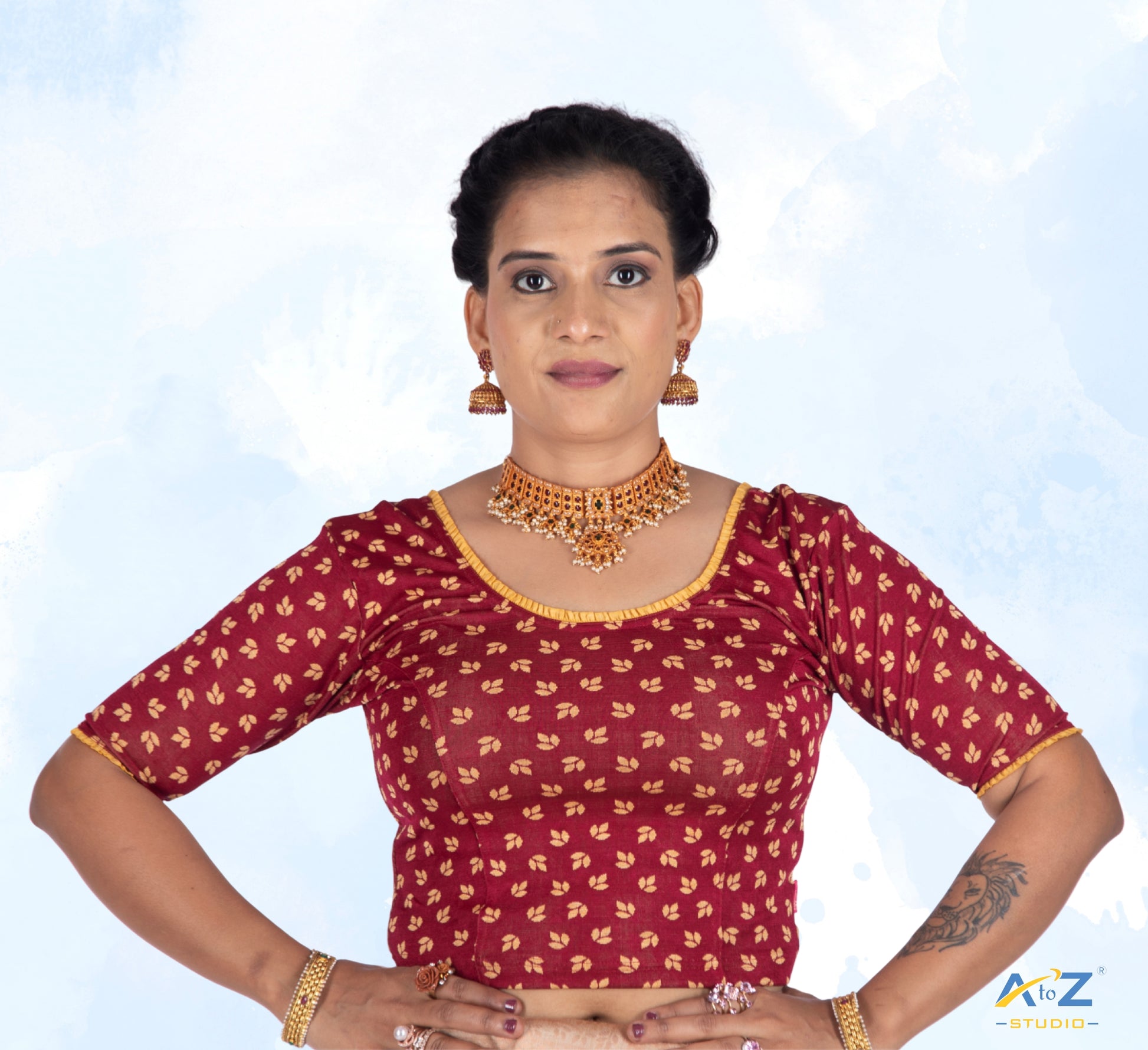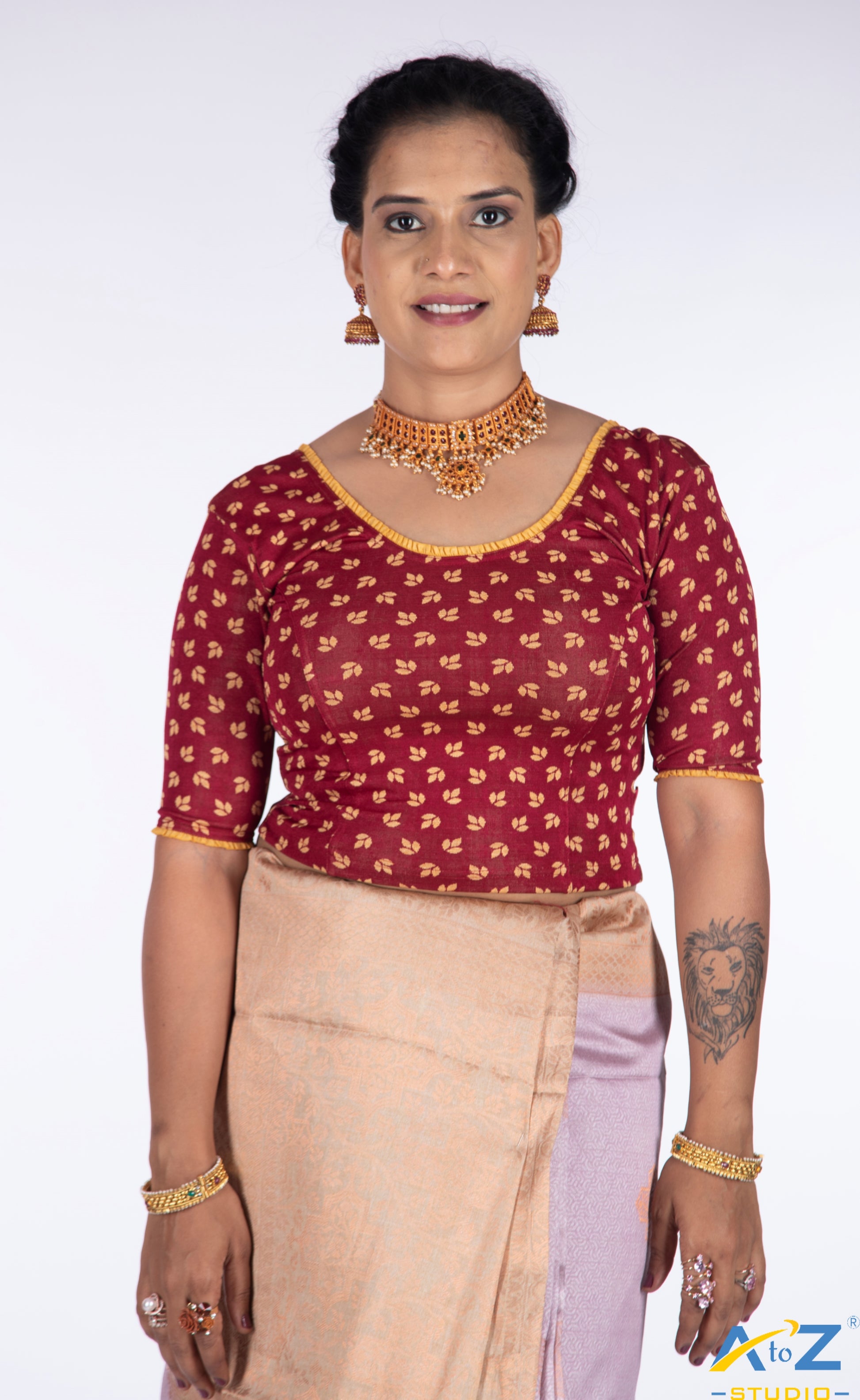 Maroon nylon lycra blouse with classic elbow sleeves and a flattering round-to-V neck design. Designed with a small leaf design featuring frill details from collar to back. A must-have for parties and festive occasions.