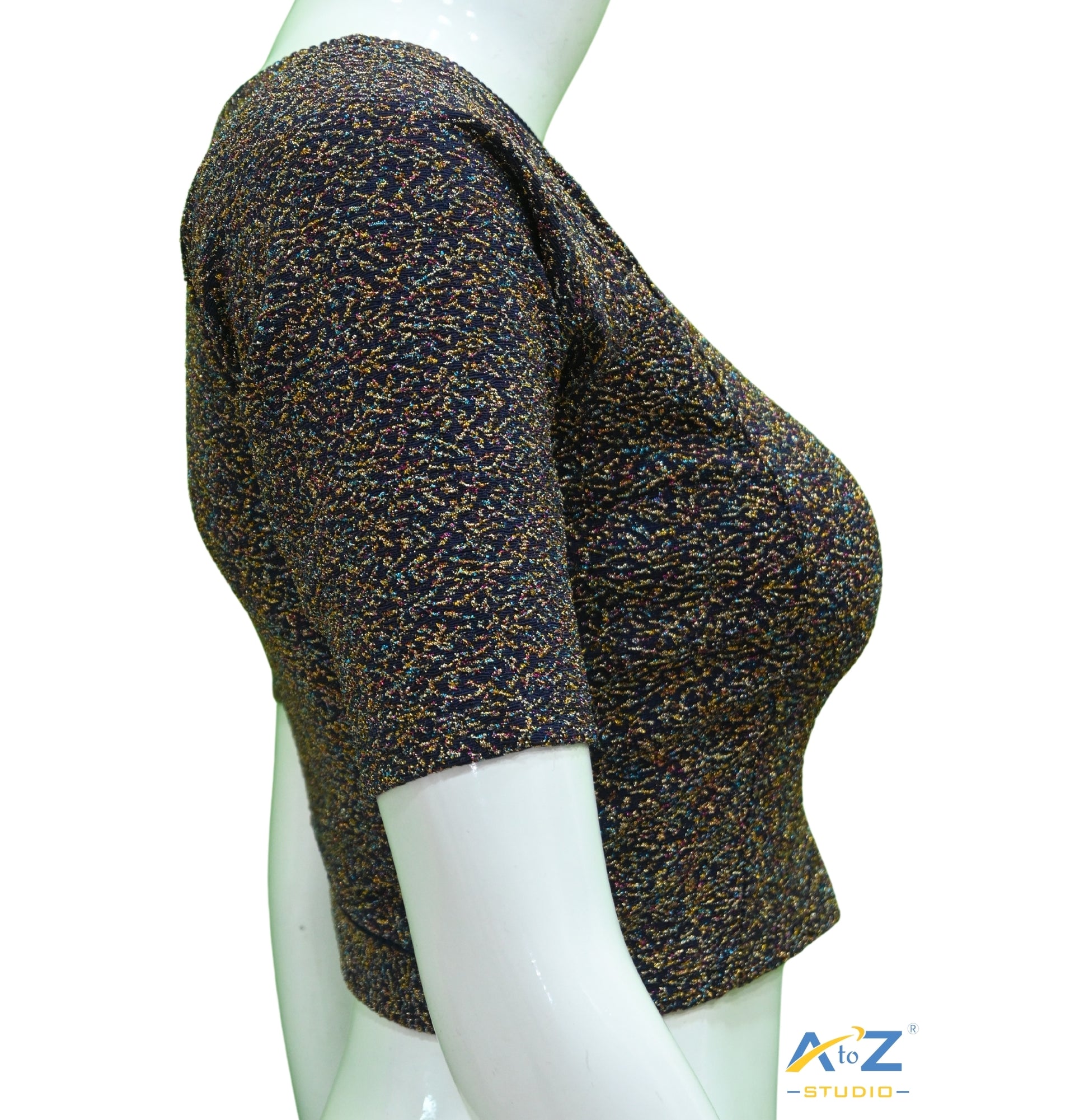 This navy blue metallic lycra blouse combines elbow sleeves, a boat neck, and a metallic jacquard design. Timelessly chic and versatile.