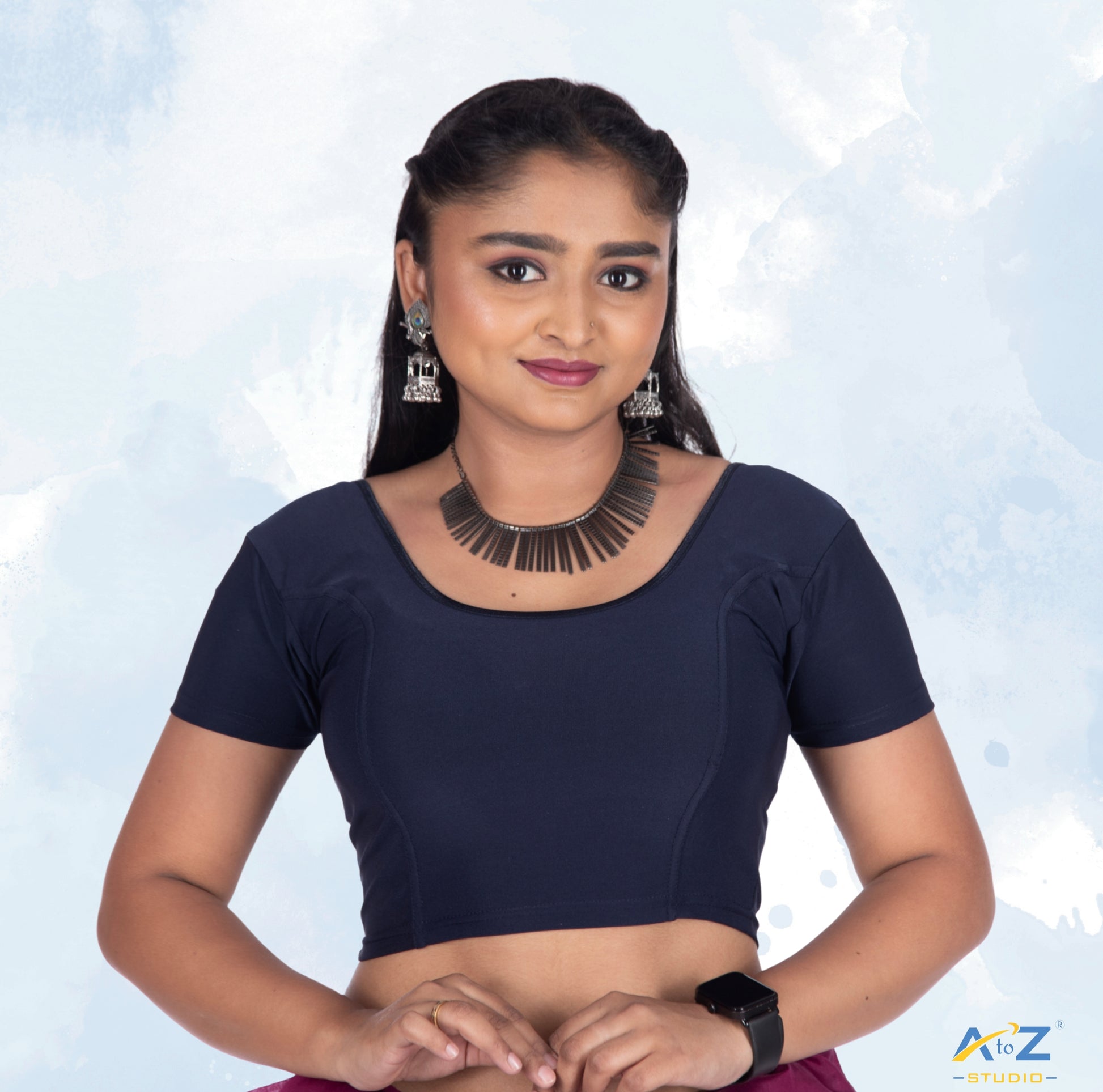 Navy Blue Polyester Lycra is the star of this short sleeve blouse, with its round neck, plain design, and versatile styling.