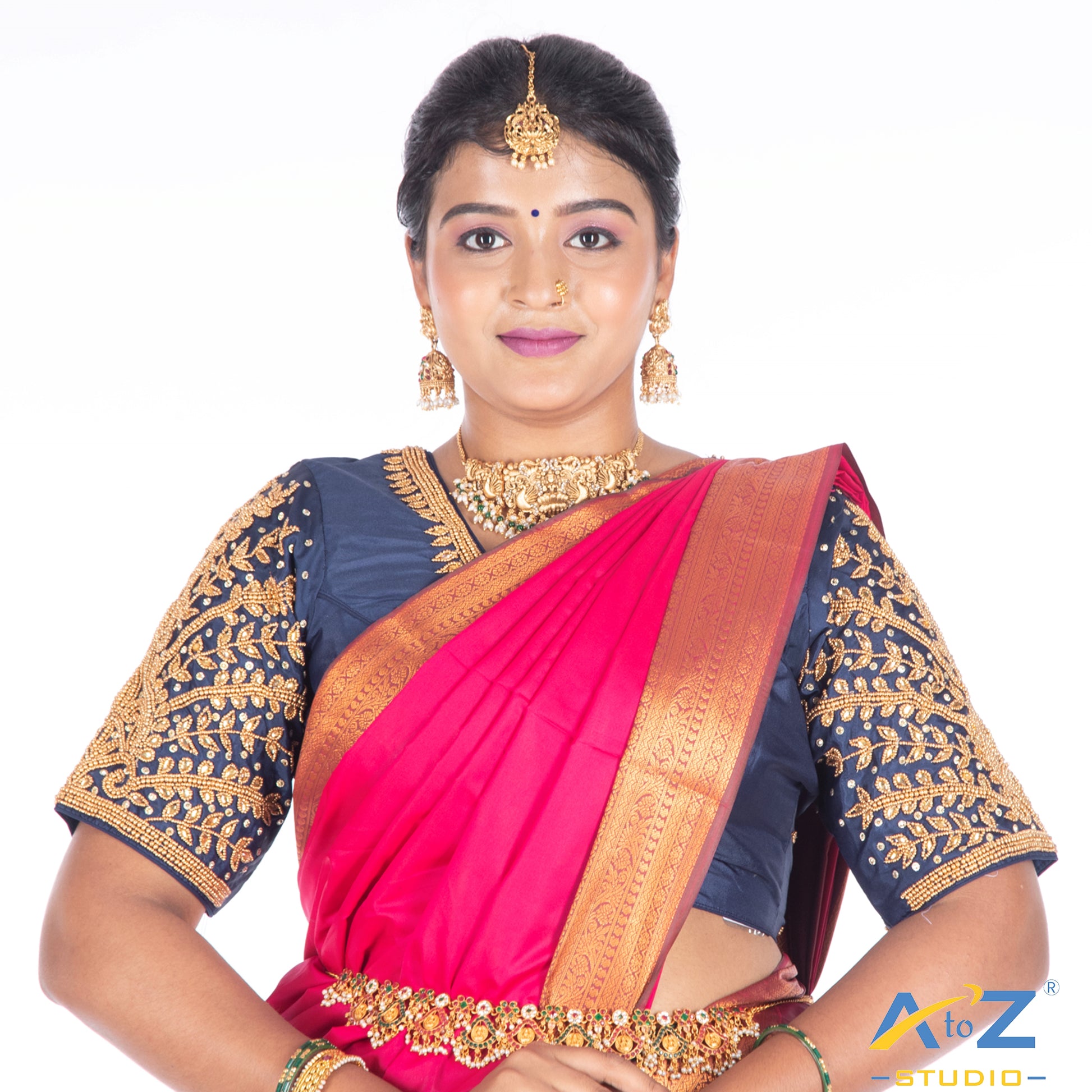 Elevate your style with this Silk Cloth blouse, featuring a stunning Aari Work design and a chic Elbow Sleeves. Perfectly crafted in Navy Blue, this blouse offers extra margins for a customizable fit and front hook closure.