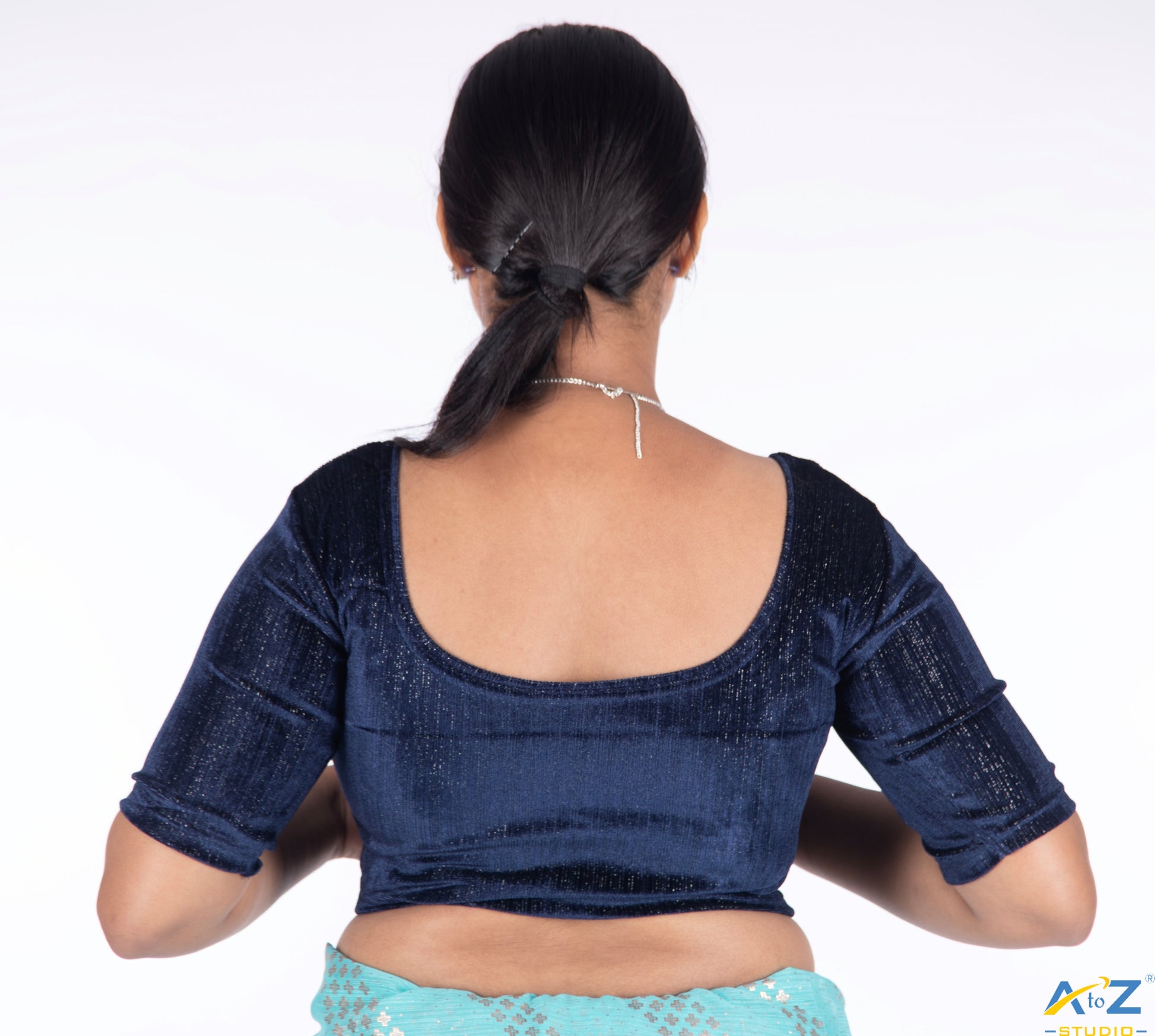 This Navy Blue Velvet blouse features elbow sleeves, a round neck, and a shimmer horizontal line design, offering sophistication with comfort.
