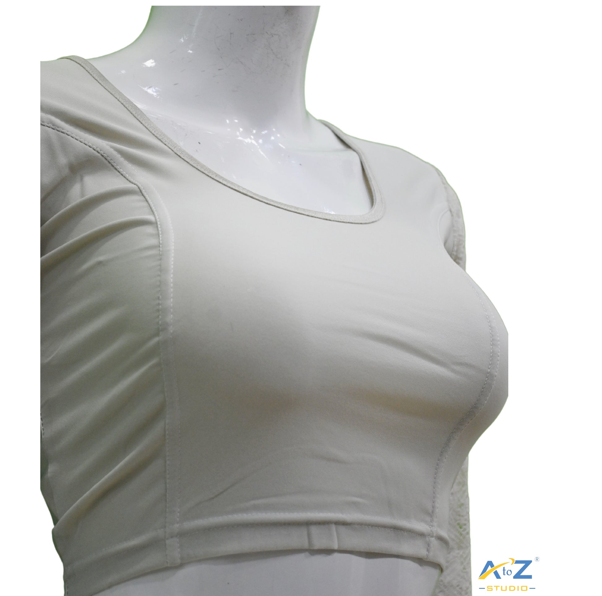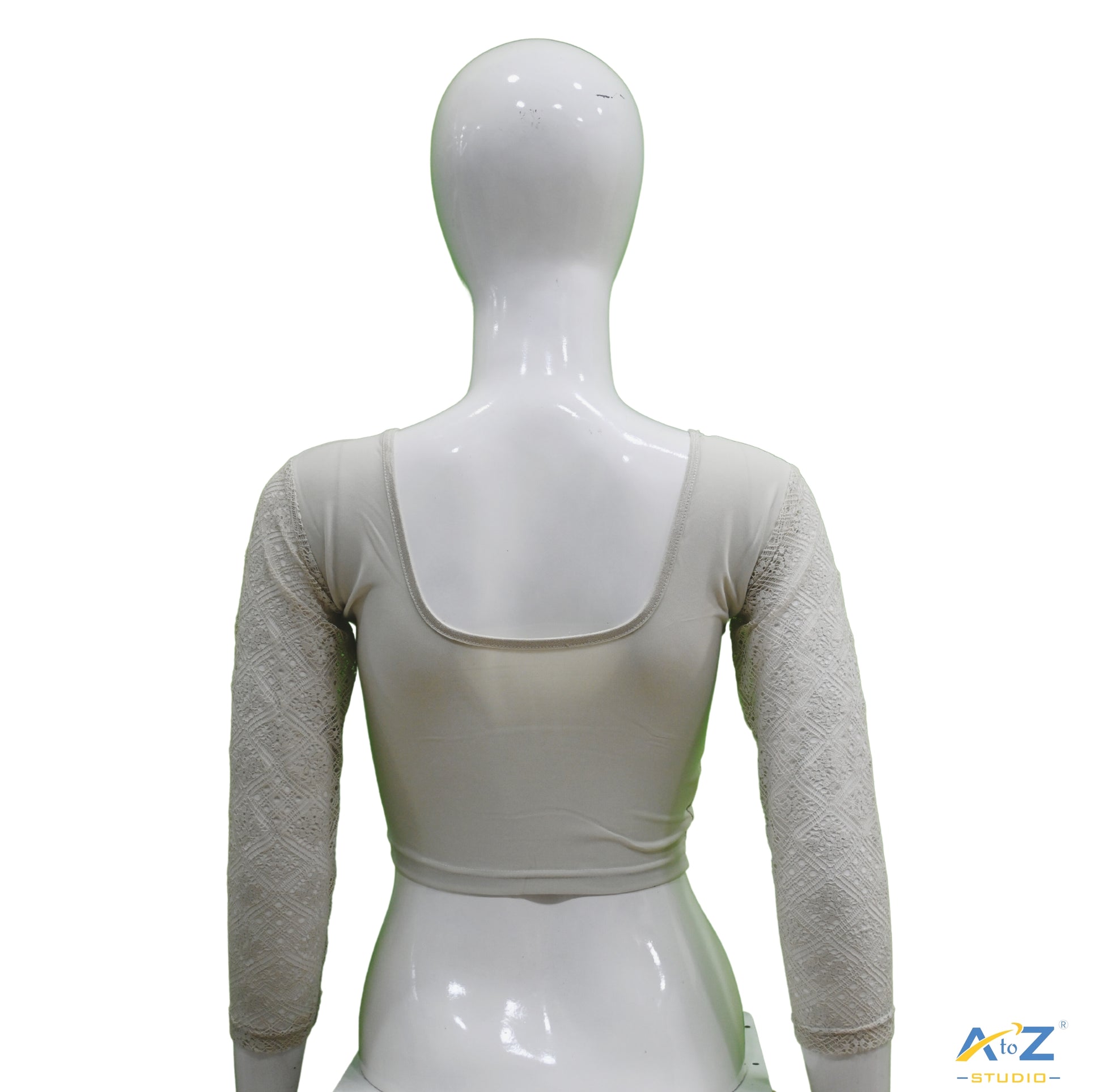 Off White Polyester Lycra makes this blouse a timeless choice with 3/4 net sleeves, a round neck, and a plain floral design on the sleeves.