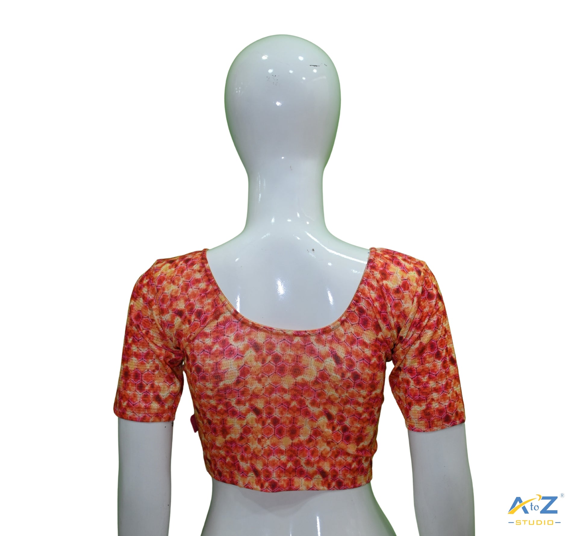 Orange-colored nylon lycra half-sleeved blouse with round neck design and hexagonal multi-print metallic jari. Timeless and versatile for every occasion and festive event.
