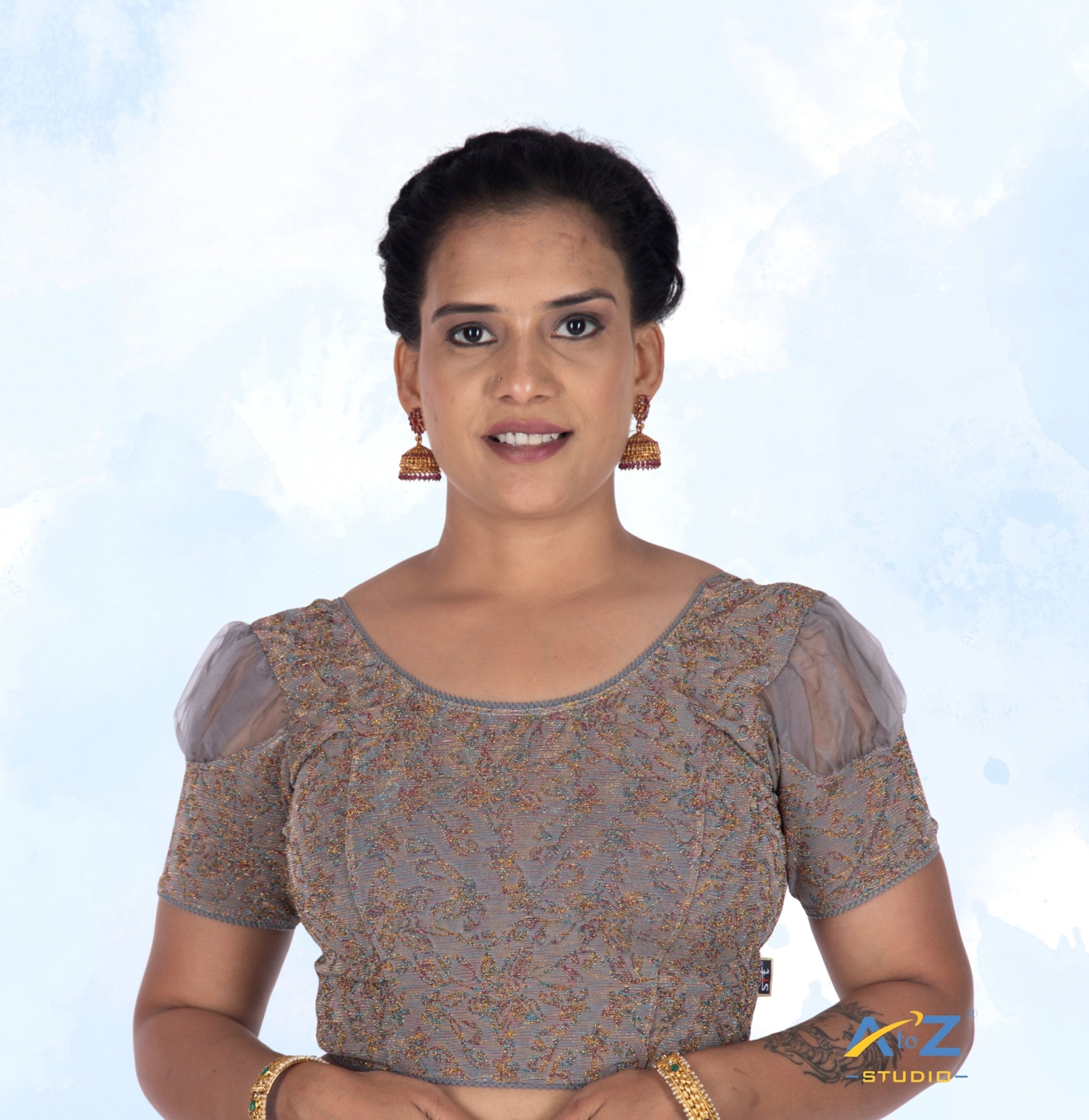 This P Grey metallic lycra blouse features puff organza net short sleeves, a 6.5-inch round neck, and a metallic jacquard design. Stylish and modern.