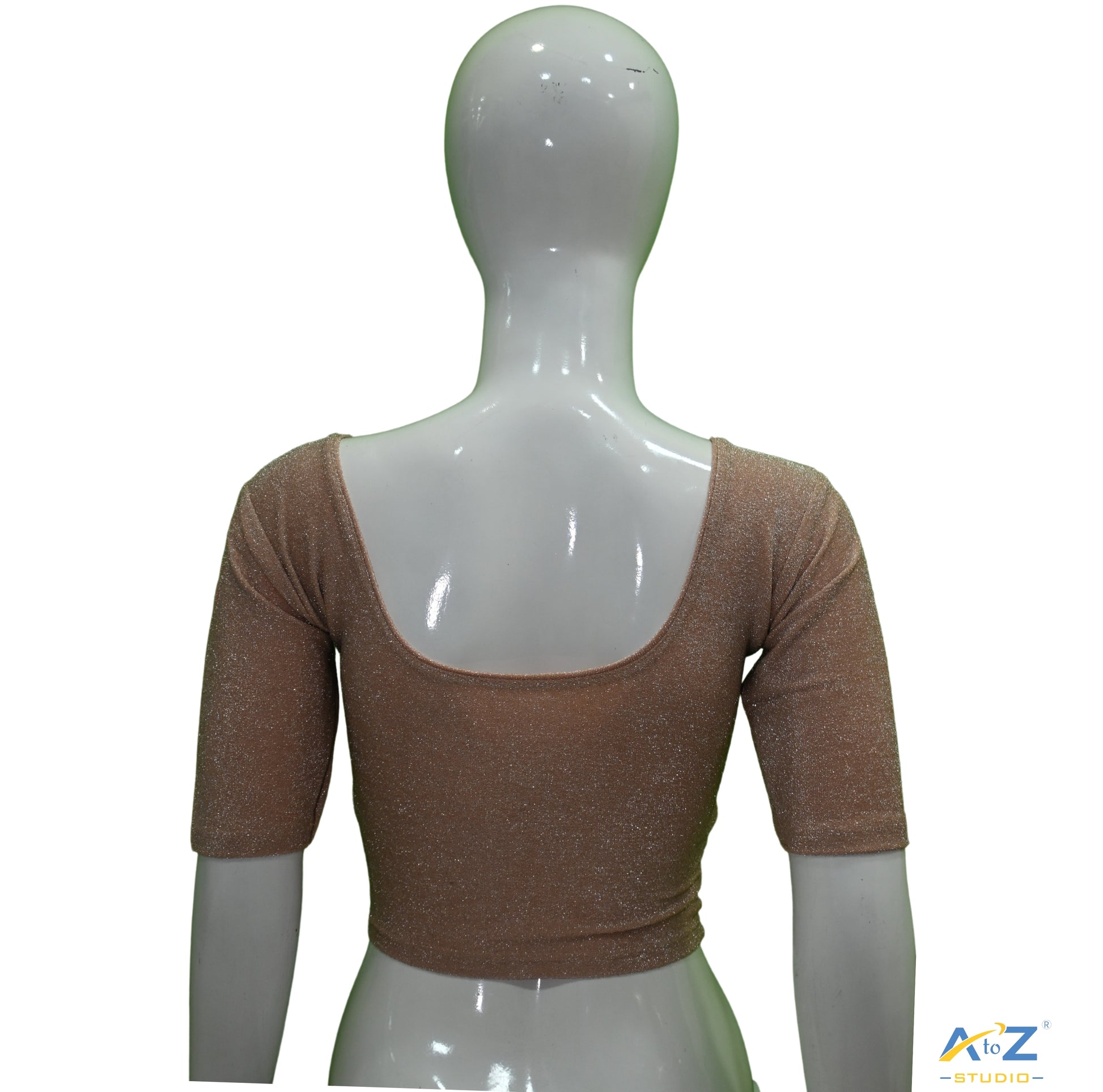 Peach Metallic Lycra is elegantly styled into this blouse, featuring shiny elbow sleeves, a round neck, and round back.
