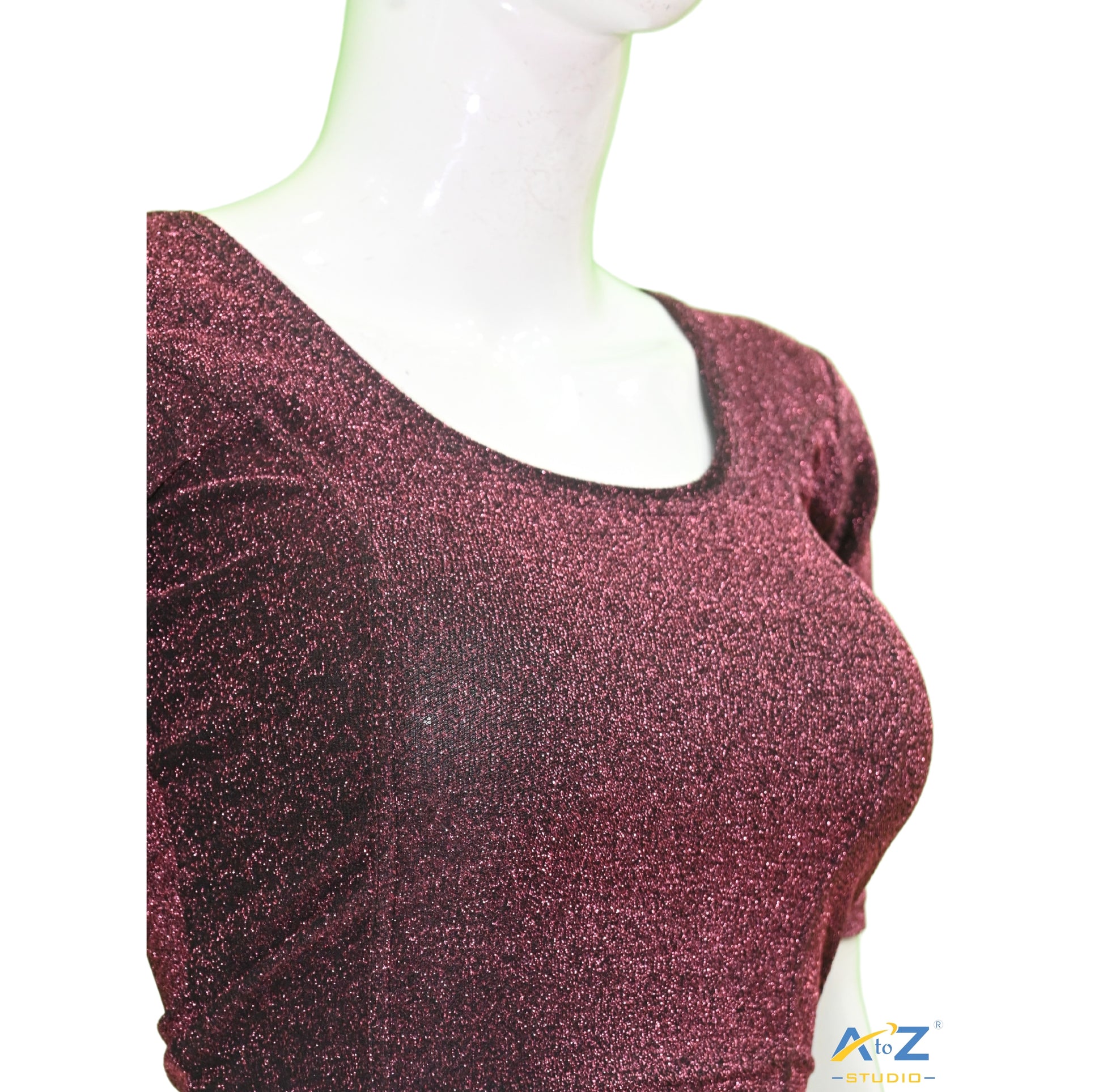 This Pink Metallic Lycra blouse features shiny elbow sleeves, a round neck, and a round back, combining style and elegance effortlessly.