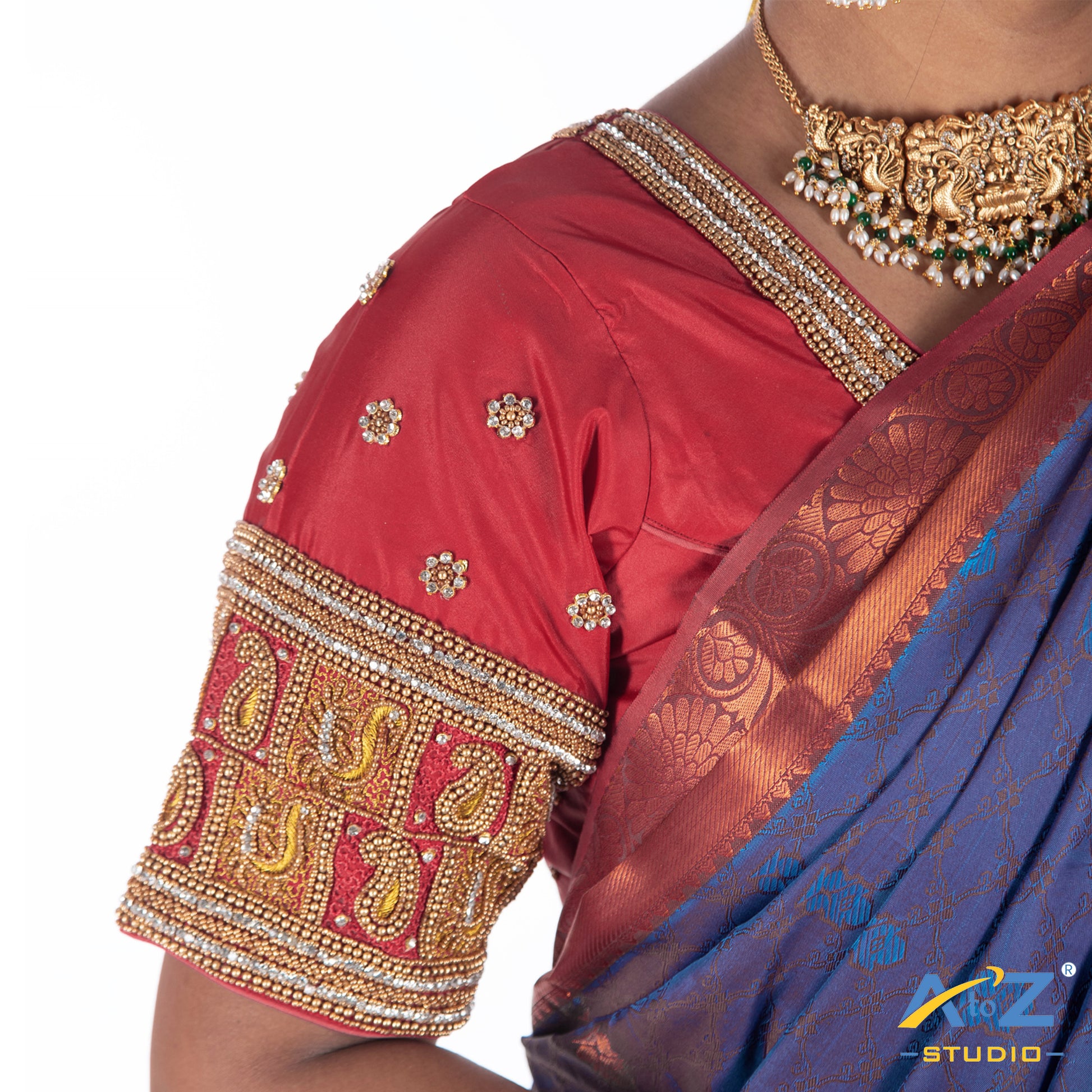 Elevate your style with this Silk Cloth blouse, featuring a stunning Aari work design and a chic Elbow Sleeves. Perfectly crafted in Punch Pink, this blouse offers extra margins for a customizable fit and front hook closure.