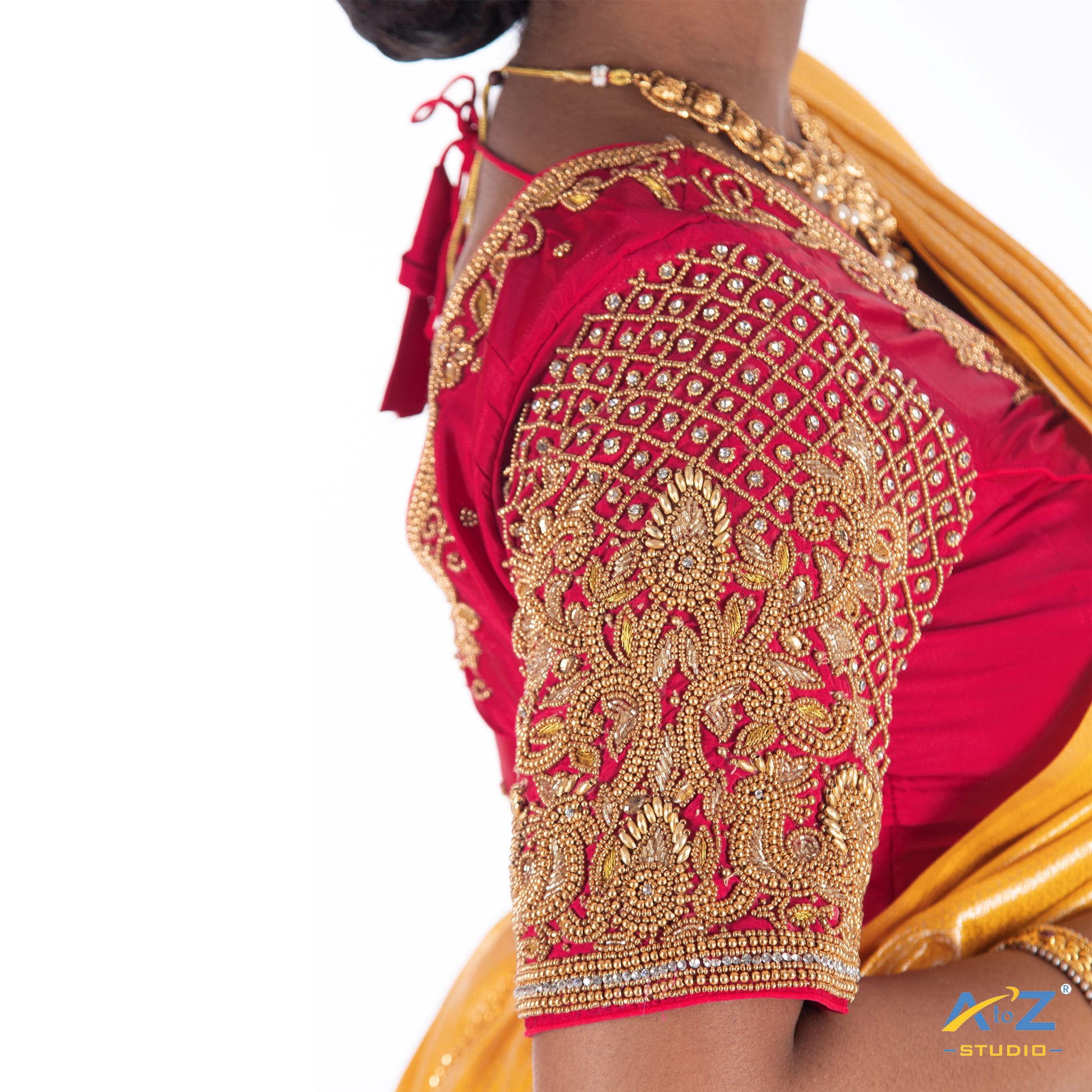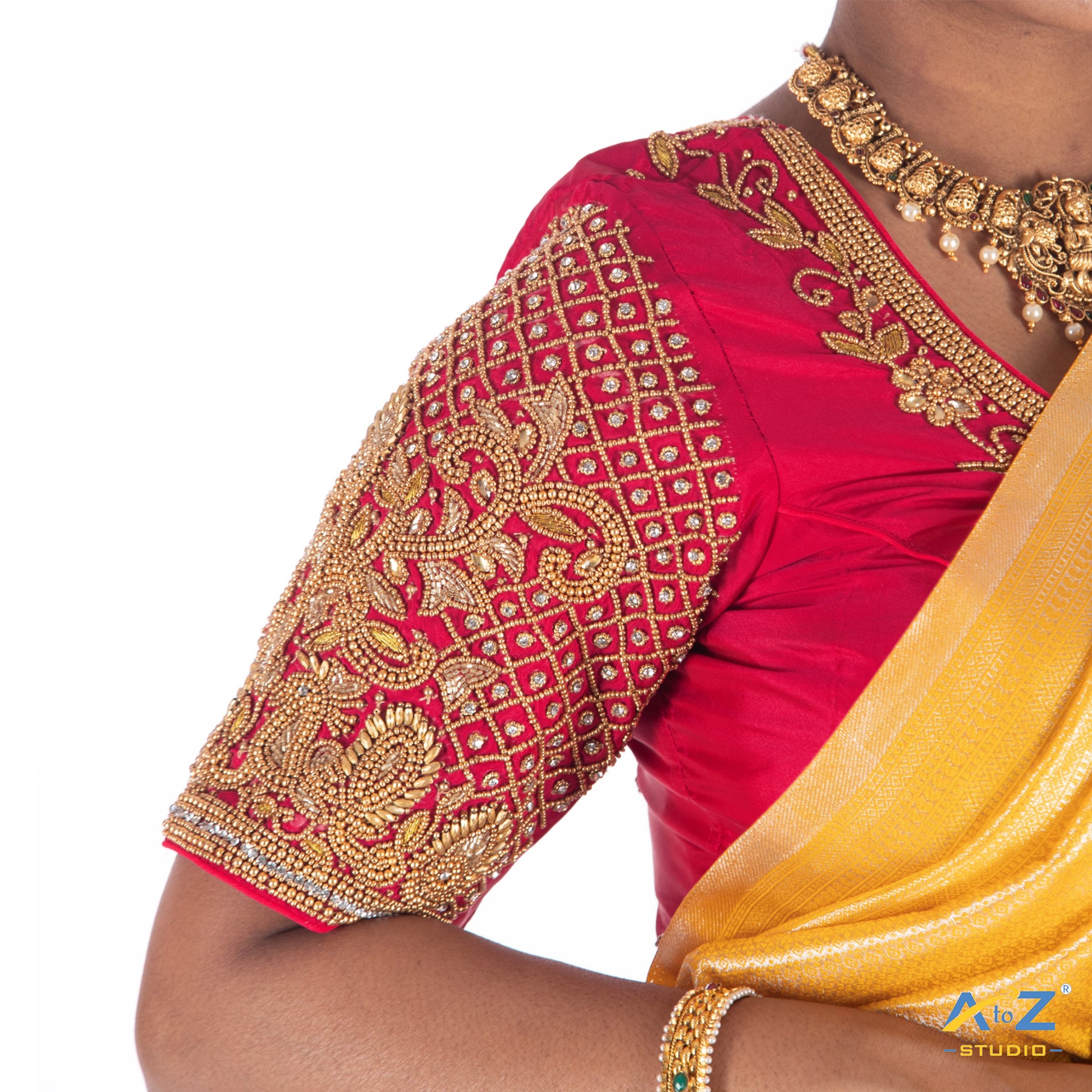 Elevate your style with this Silk Cloth blouse, featuring a stunning Aari Work design and a chic Elbow Sleeves. Perfectly crafted in Punch Pink, this blouse offers extra margins for a customizable fit and front hook closure.
