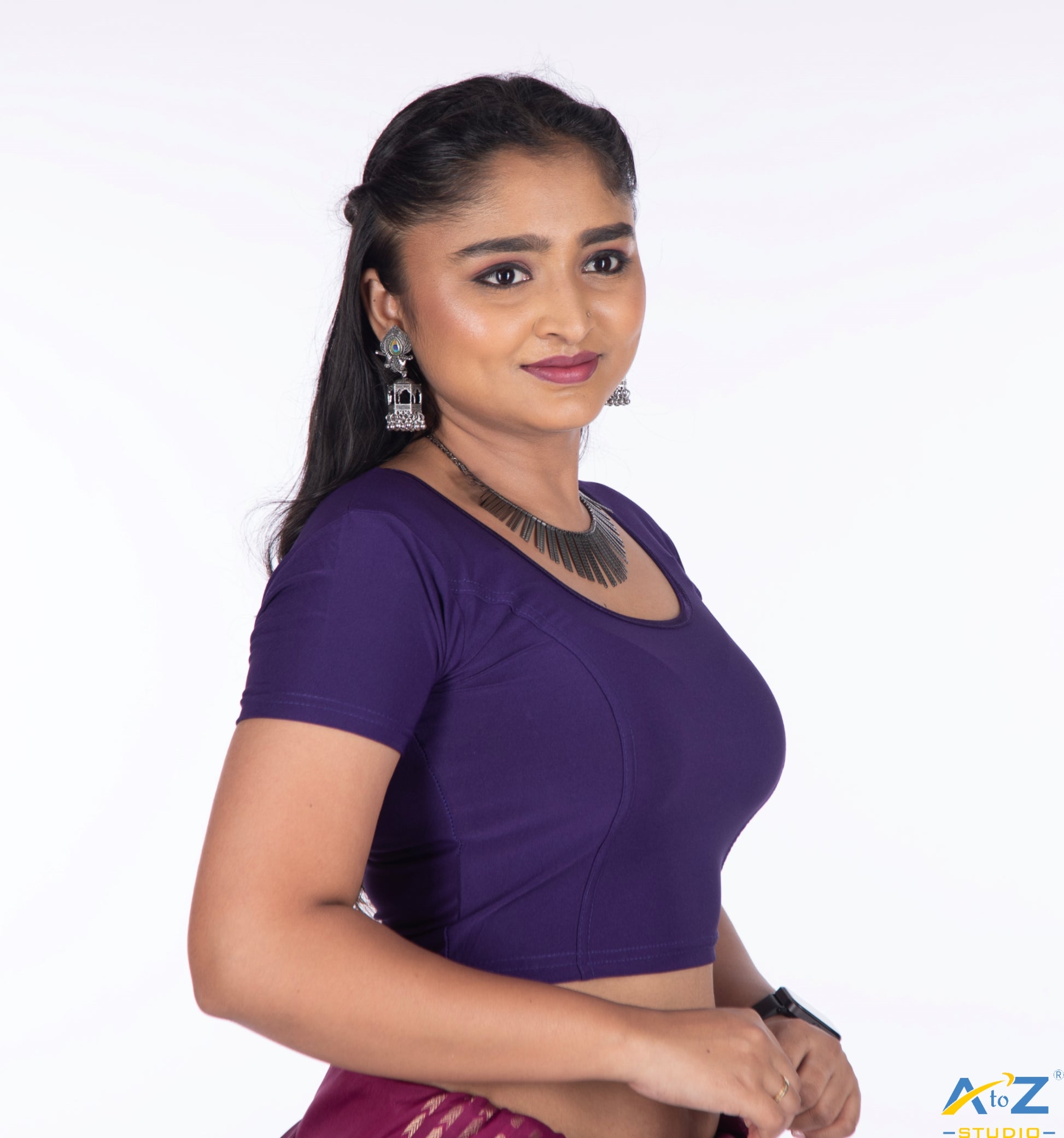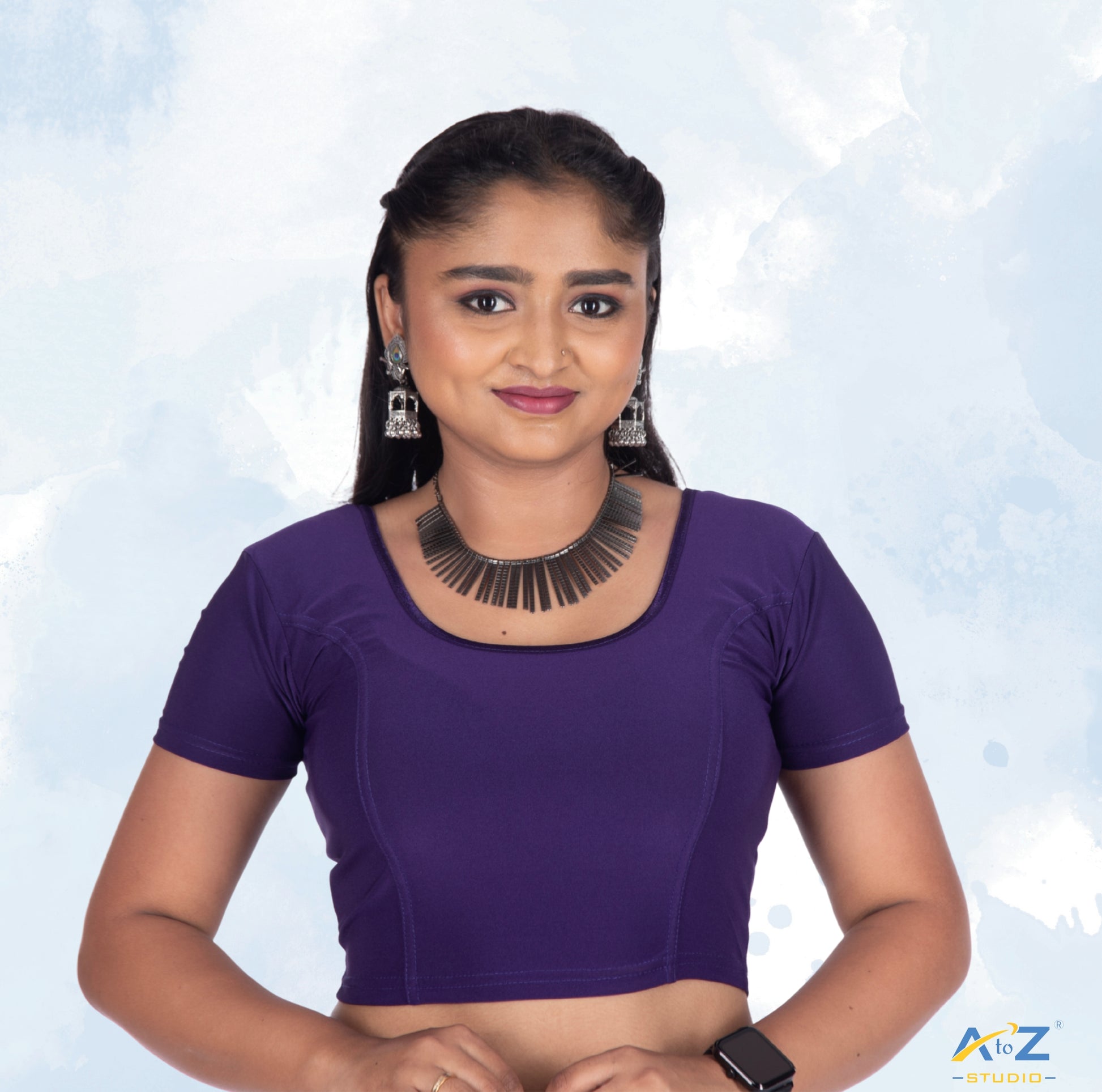 Purple Polyester Lycra adds sophistication with this short sleeve blouse, featuring a round neck and plain design.