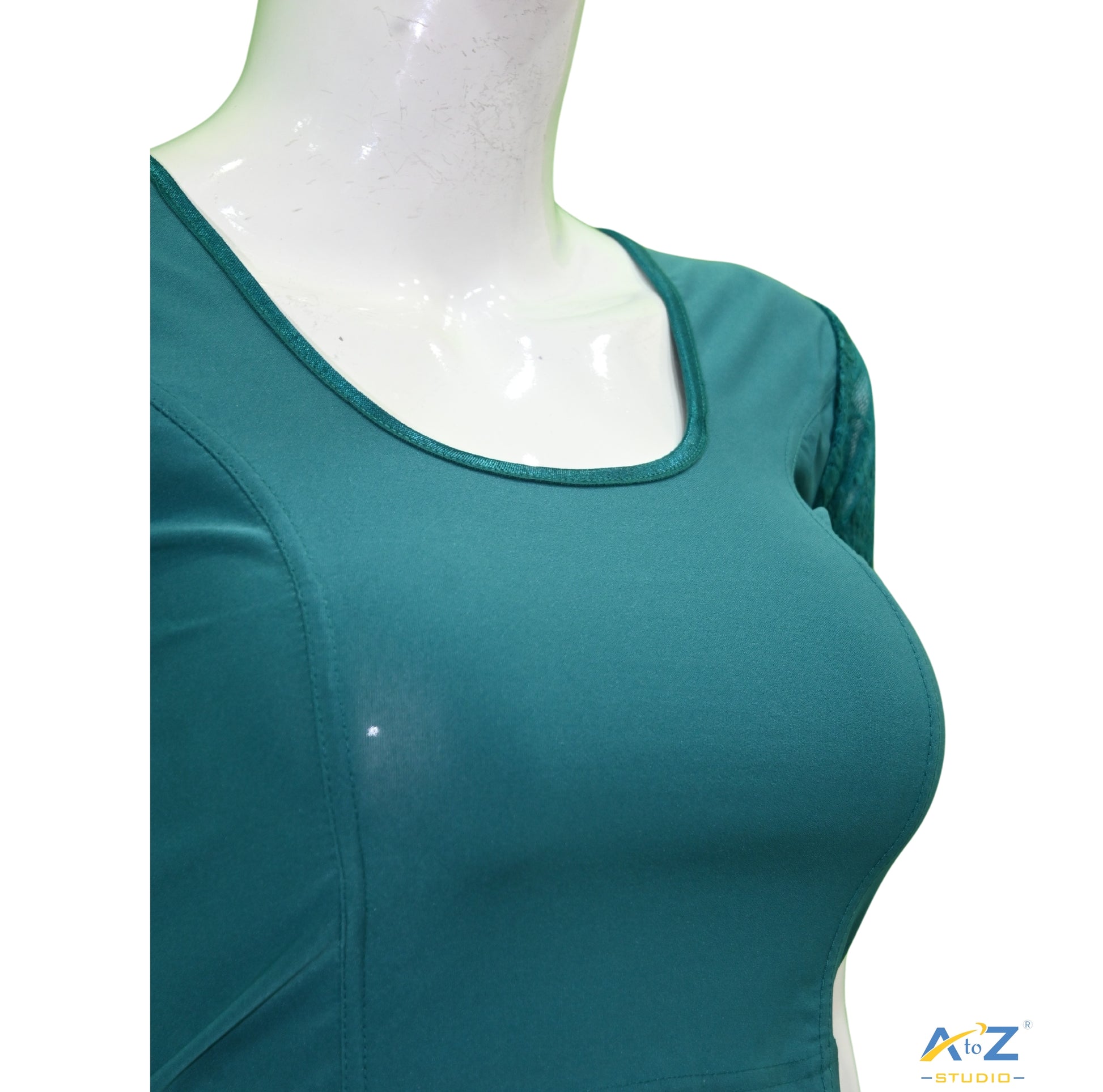 This Rama Green Polyester Lycra blouse features net short sleeves, a round neck, and a plain and flower print in the sleeves.