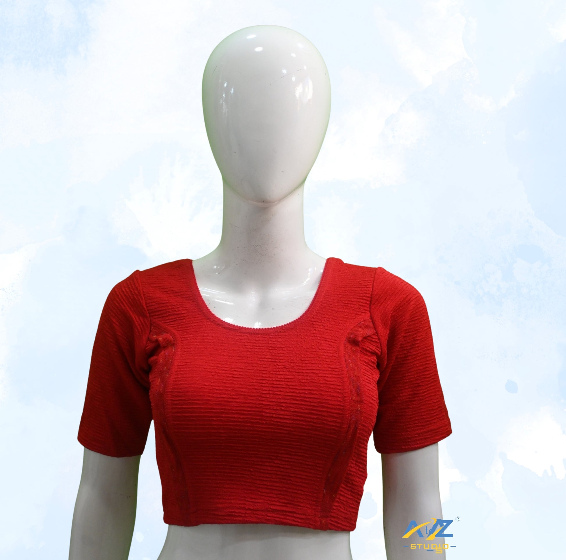 This vibrant design features a round neck with a stylish bow at the shoulder side in front and a round back neckline, paired with elegant elbow sleeves. Made from soft crush fabric in a striking red color, it showcases unique horizontal tissue crush lines for a bold and timeless look.