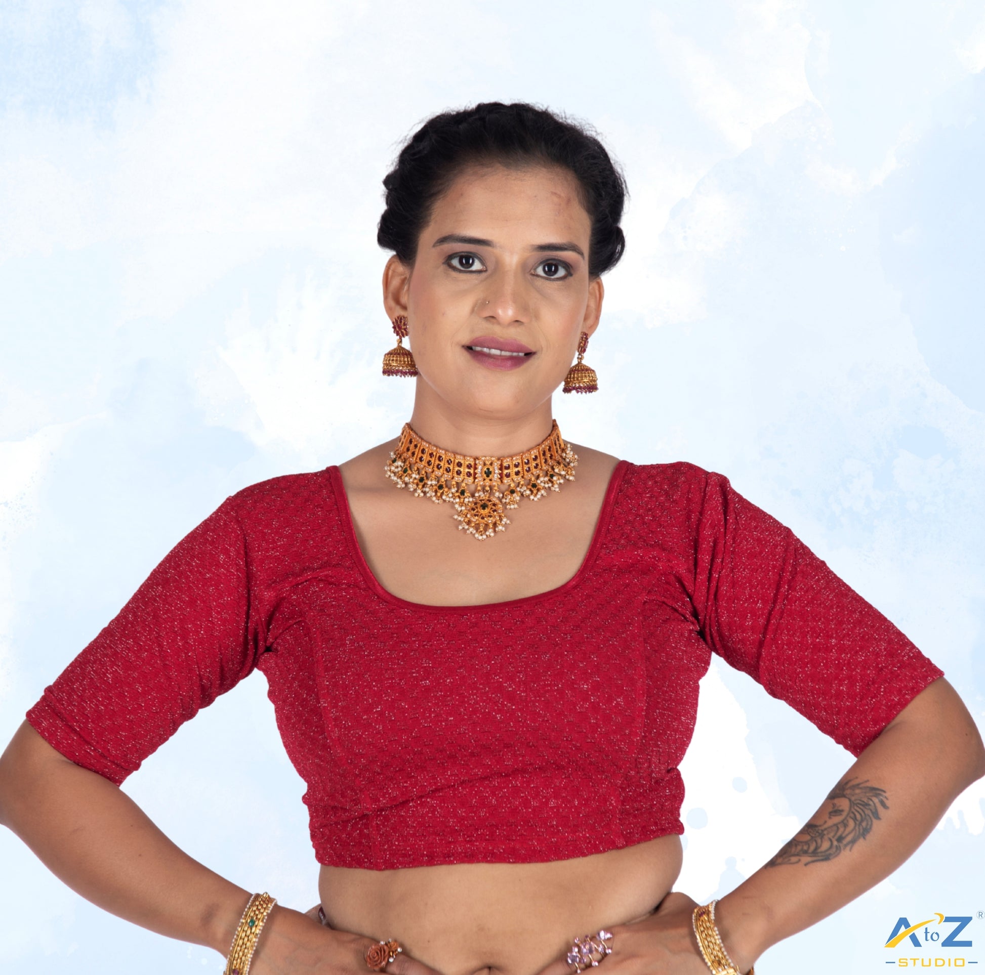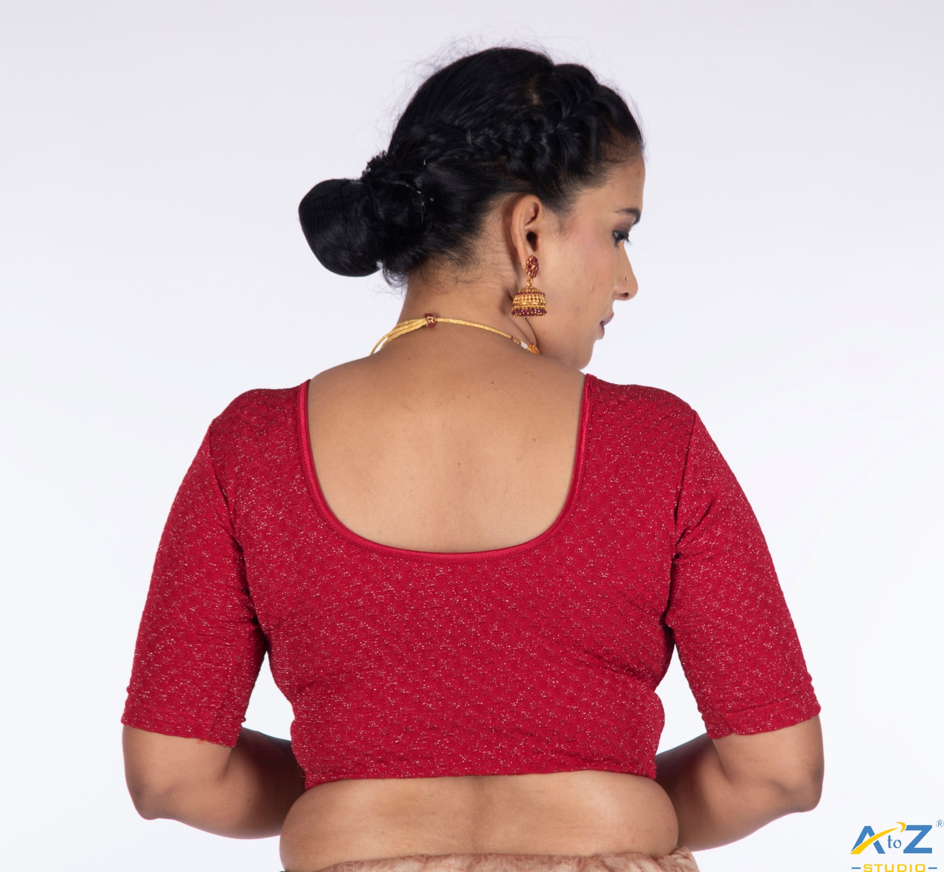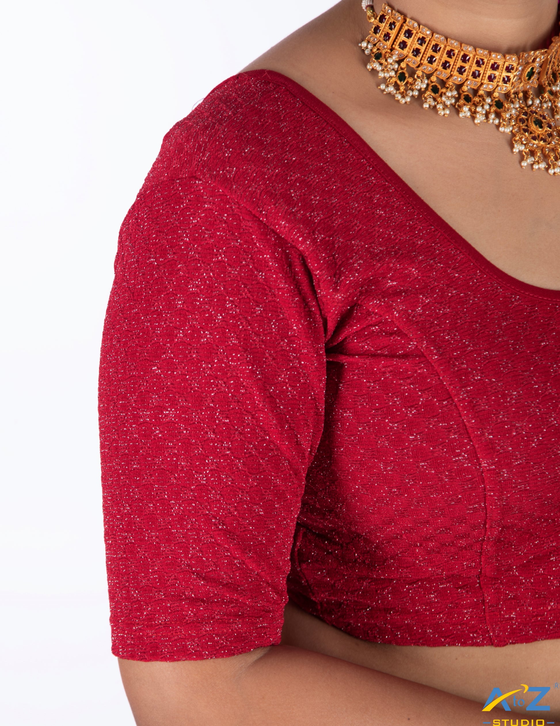 This Red Crush fabric blouse features short sleeves, a round neck, and a shimmering tissue small square design, perfect for any occasion.