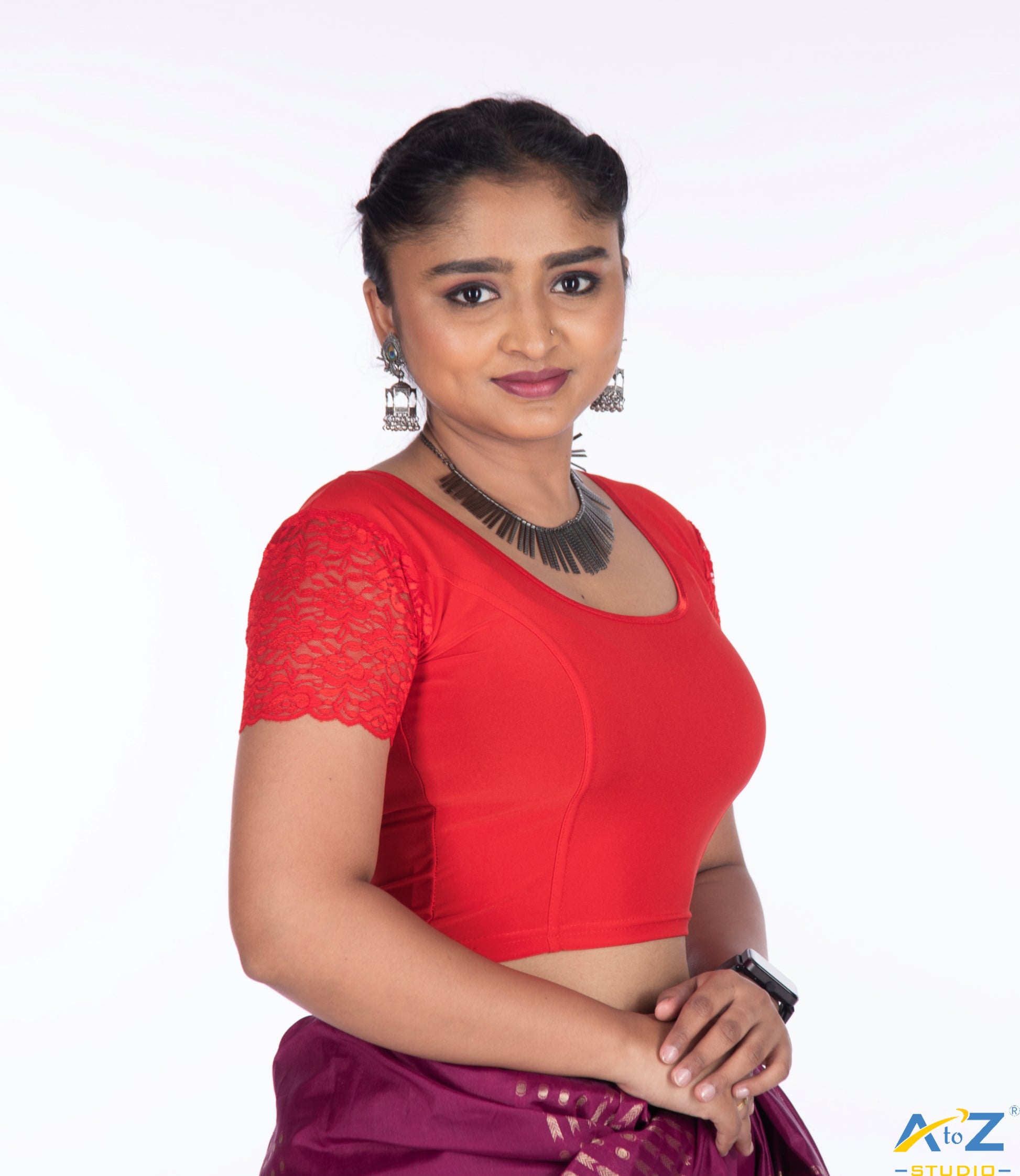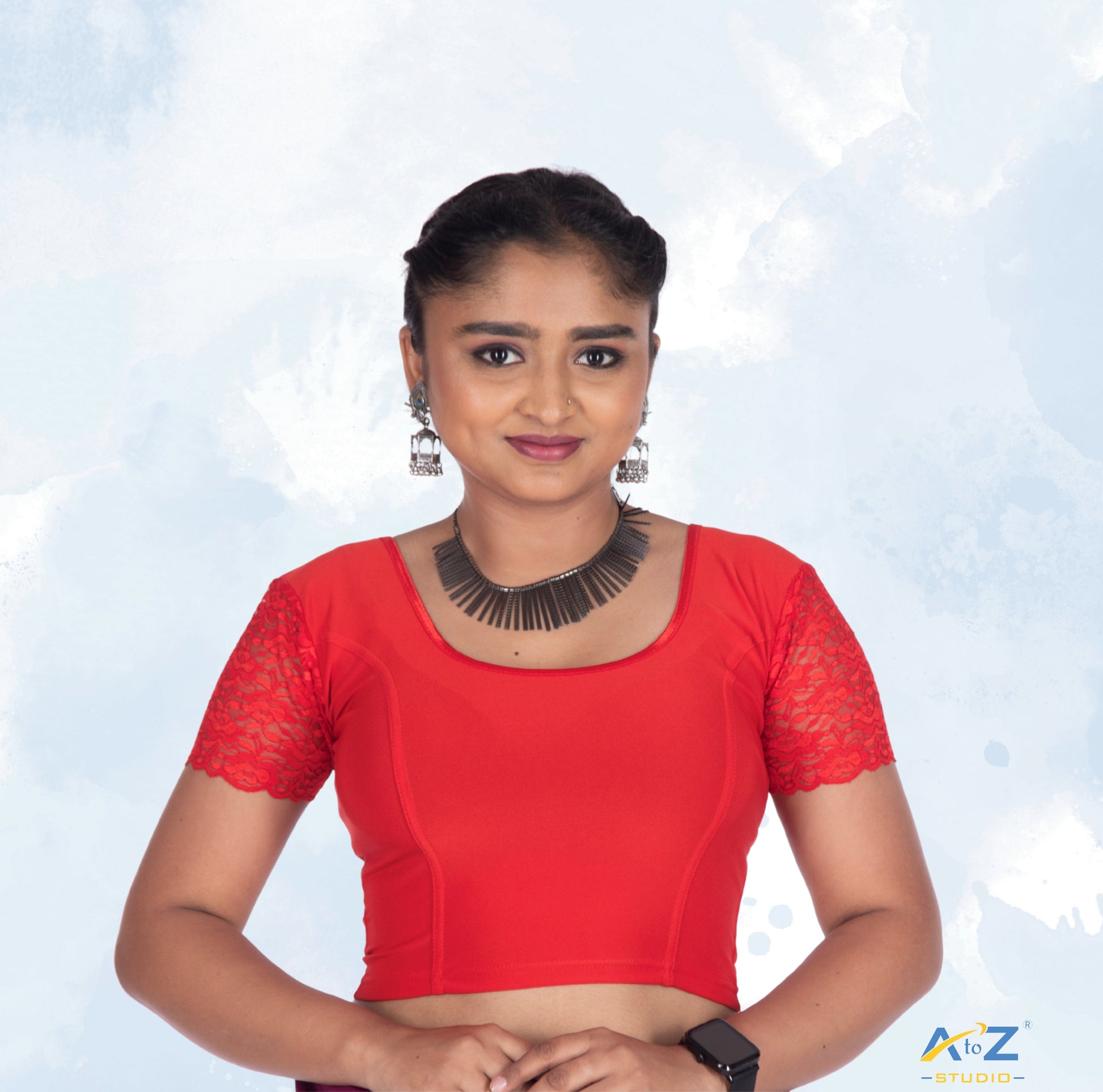 This Red Polyester Lycra blouse features net short sleeves, a round neck, and a stunning plain and flower print in the sleeves for added flair.