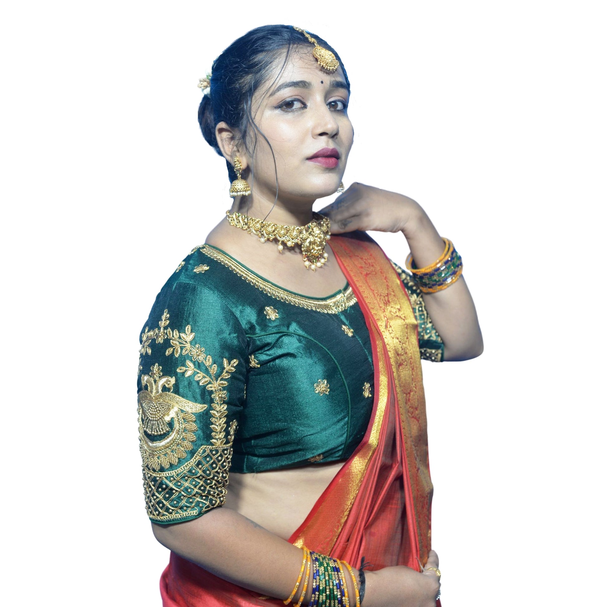 Make a majestic statement with thisDark Green blouse featuring elegant peacock motifs on the shoulders, a one-of-a-kind double peacock embroidery on the back, and criss-cross detailing for added texture. A perfect blend of traditional grace and modern artistry.