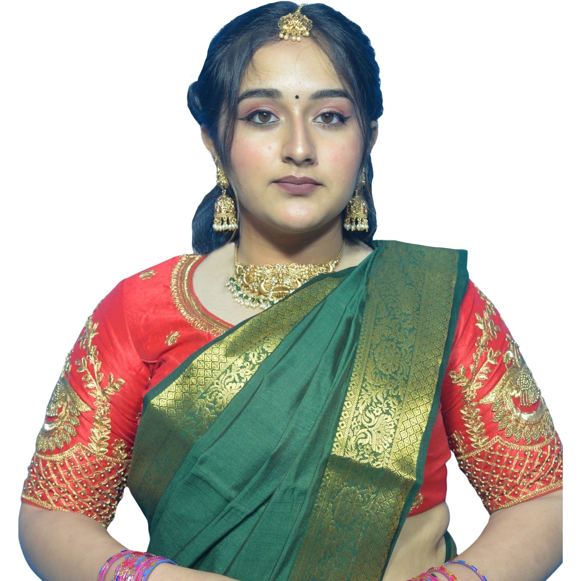 Make a majestic statement with thisRed blouse featuring elegant peacock motifs on the shoulders, a one-of-a-kind double peacock embroidery on the back, and criss-cross detailing for added texture. A perfect blend of traditional grace and modern artistry.