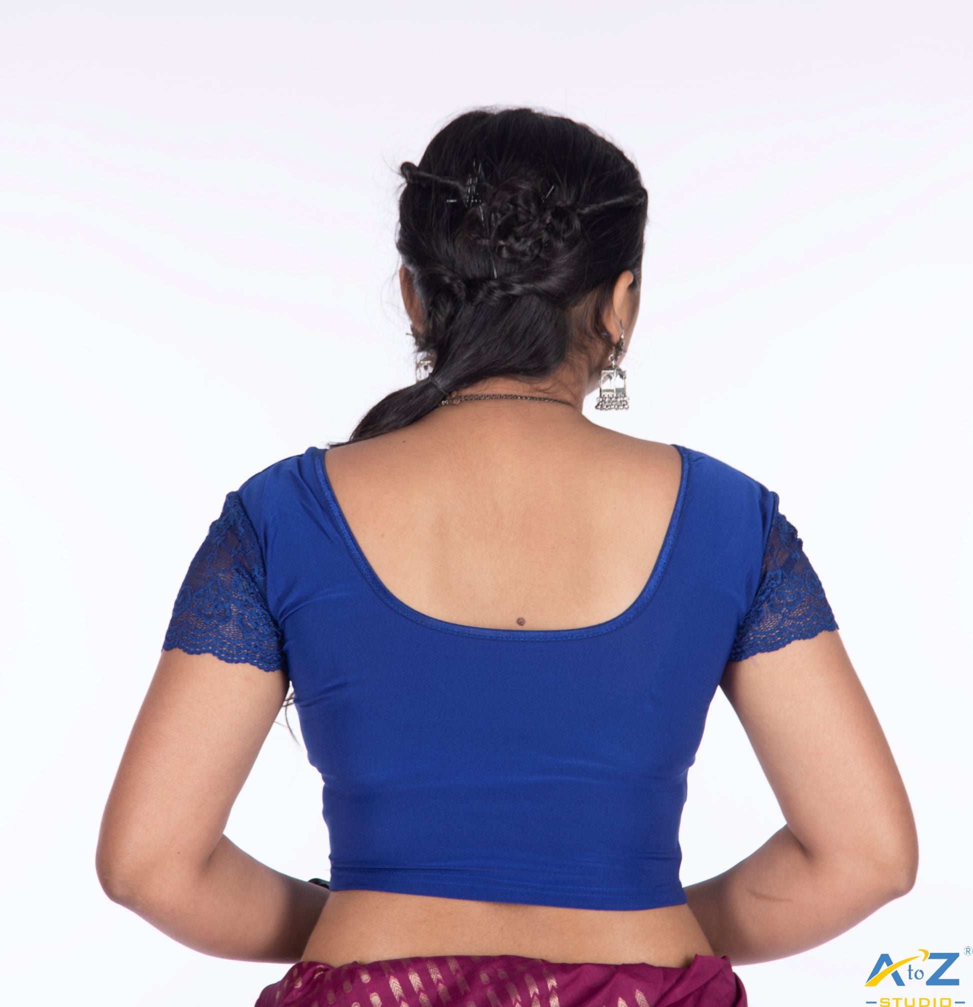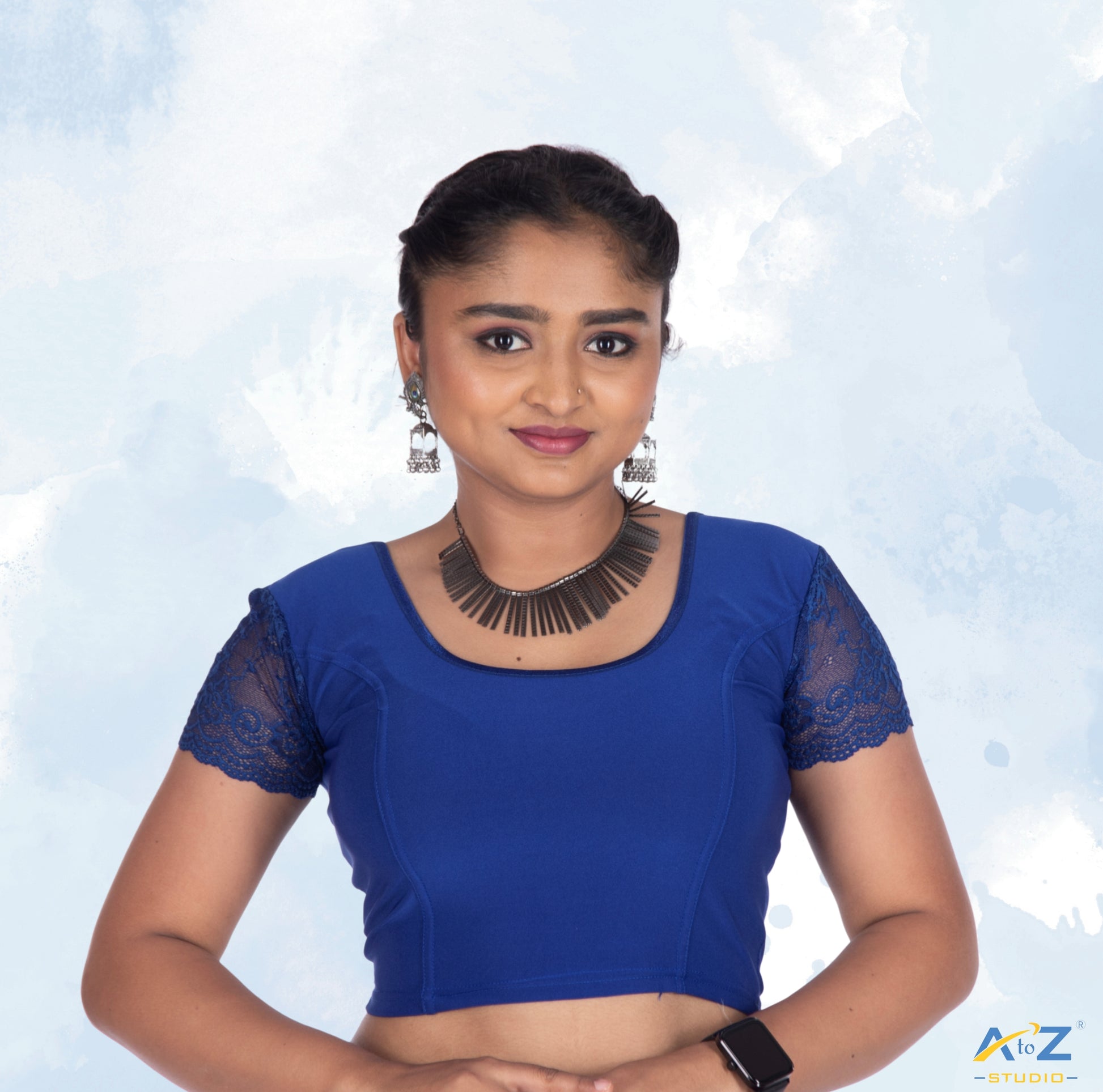 This Royal Blue Polyester Lycra blouse features net short sleeves, a round neck, and a gorgeous plain and flower print in the sleeves.