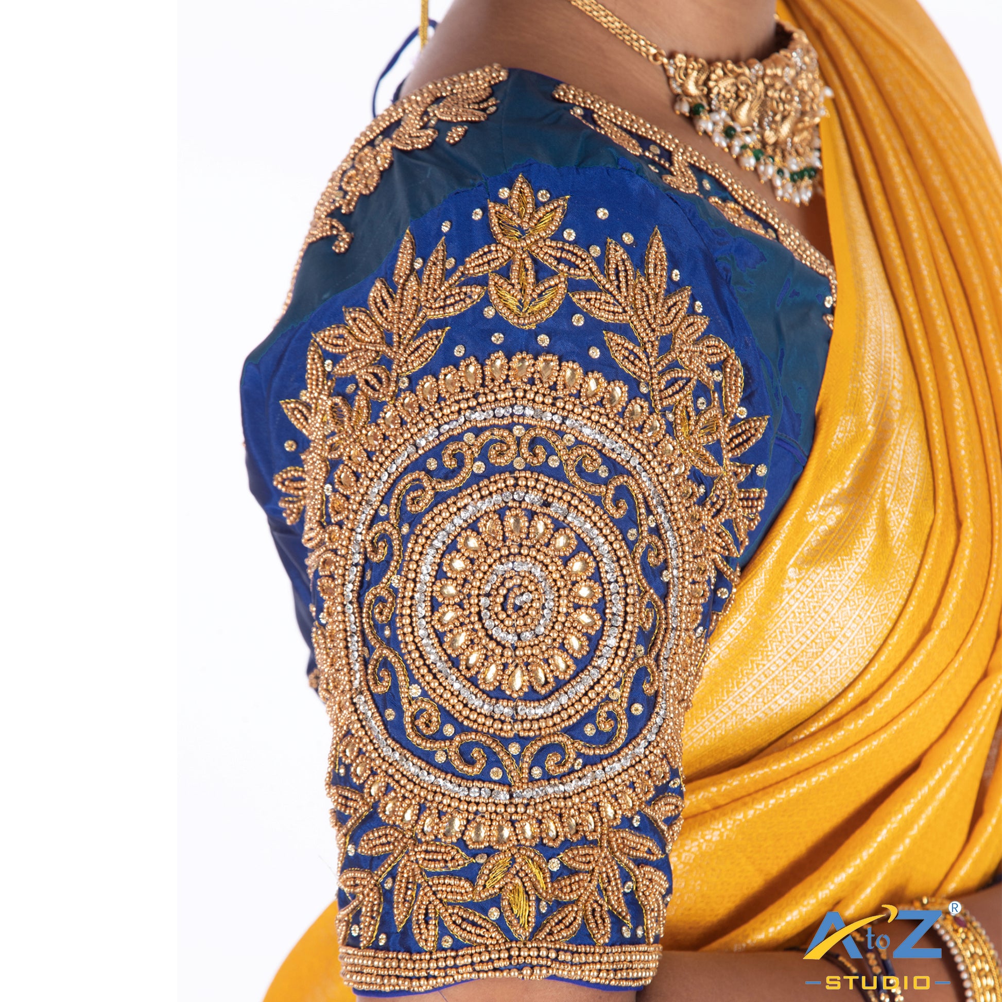 Elevate your style with this Silk blouse, featuring a stunning Aari Work design and a chic Elbow Sleeves. Perfectly crafted in Royal Blue, this blouse offers extra margins for a customizable fit and front hook closure.