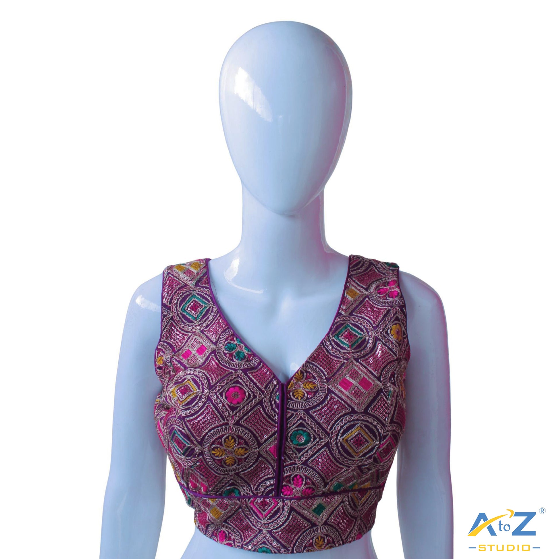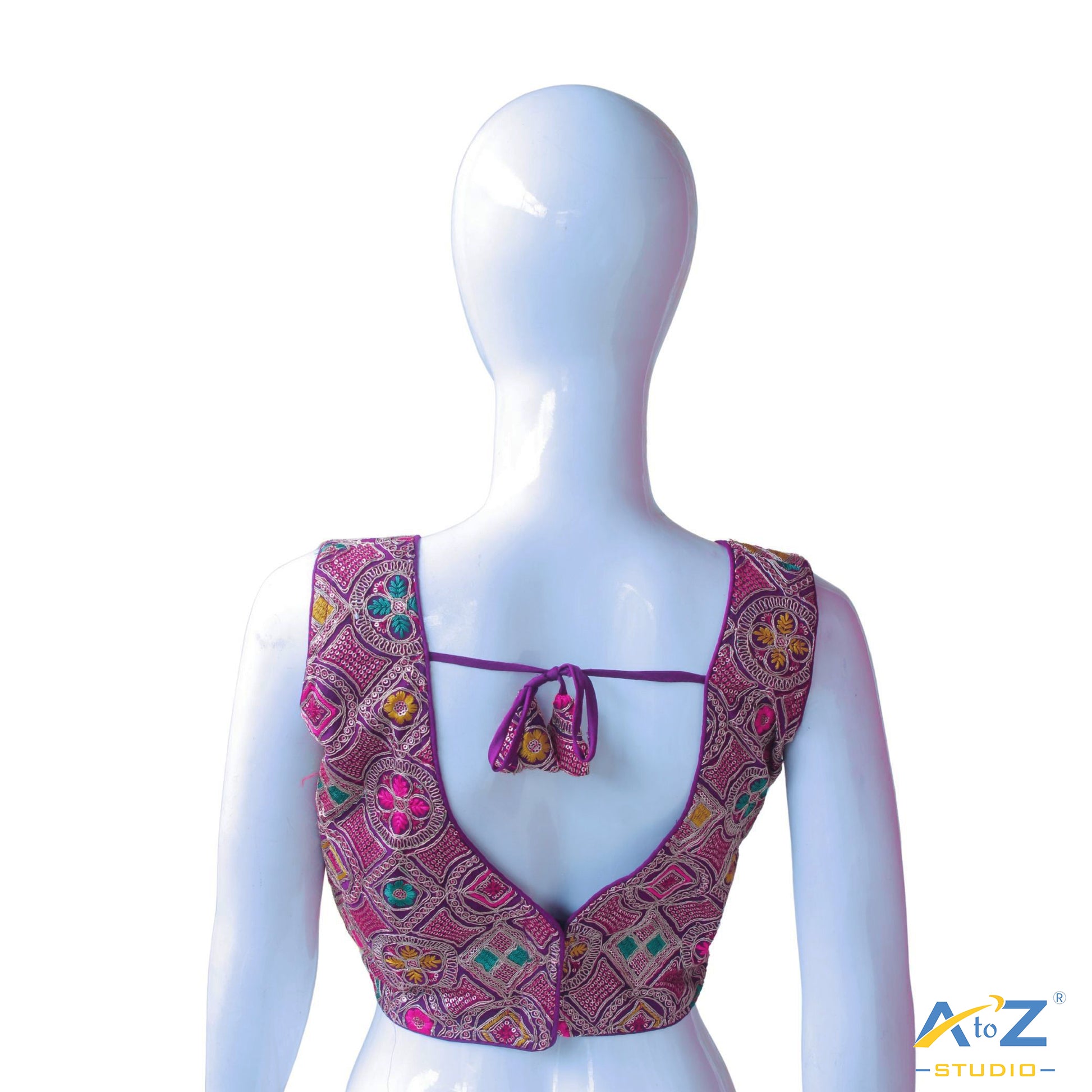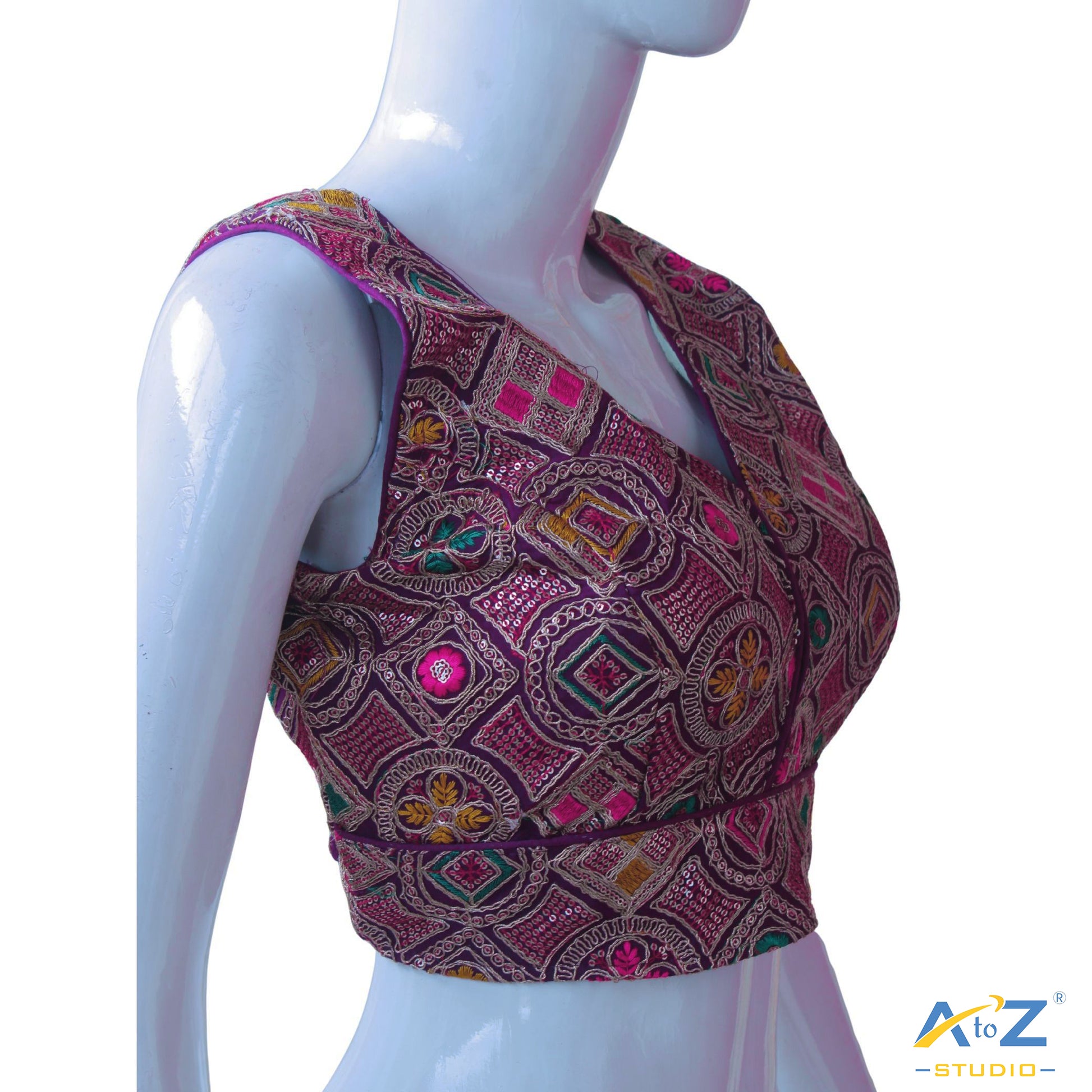 This blouse features intricate gold threadwork with vibrant embellishments of green, pink, and yellow. The rich purple border and tie-up detailing add a royal touch, perfect for festive celebrations and traditional events.
