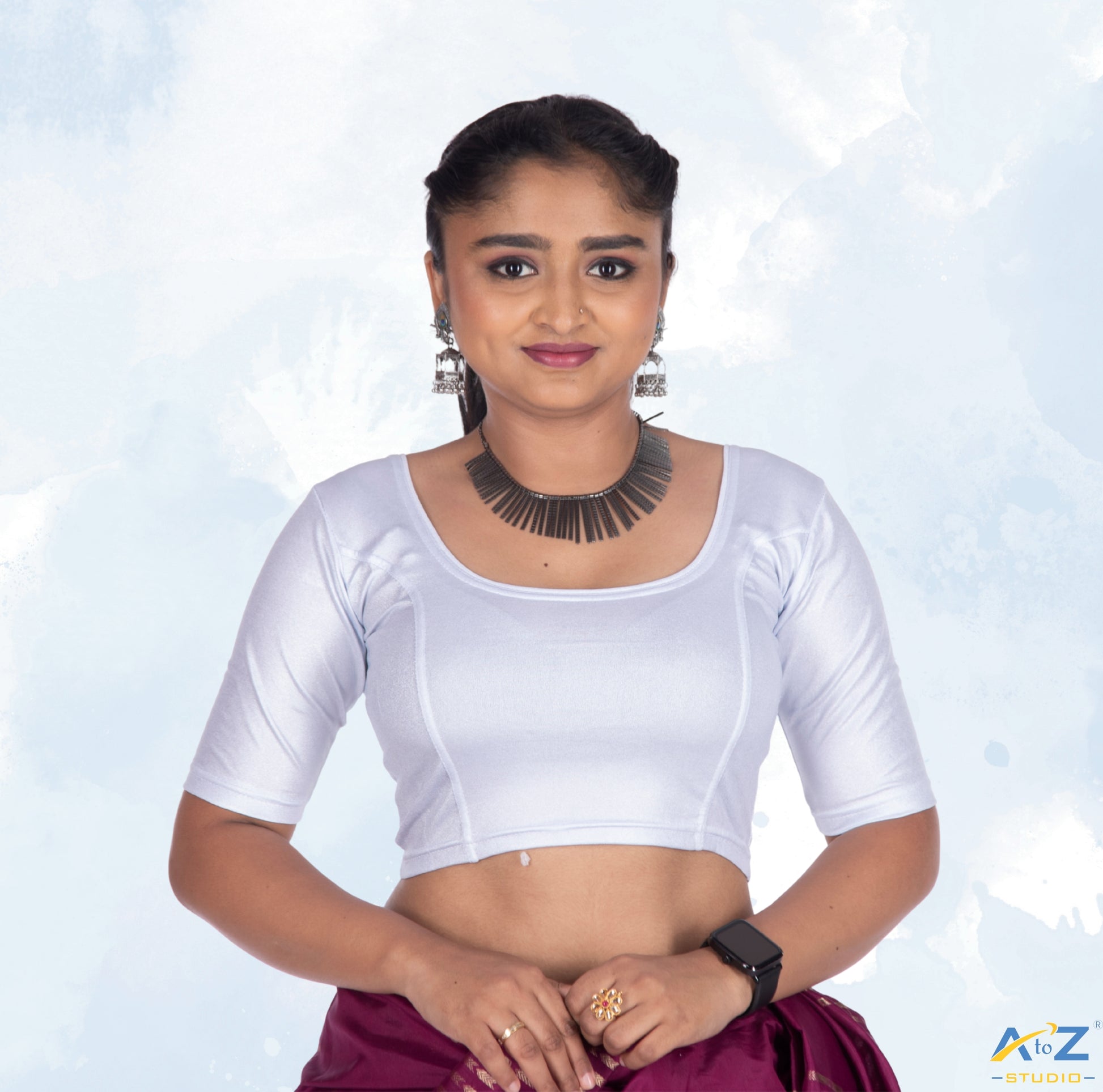 This Silver Lycra Shimmer blouse features elbow sleeves, a round neck, and a plain shiny design, exuding elegance.