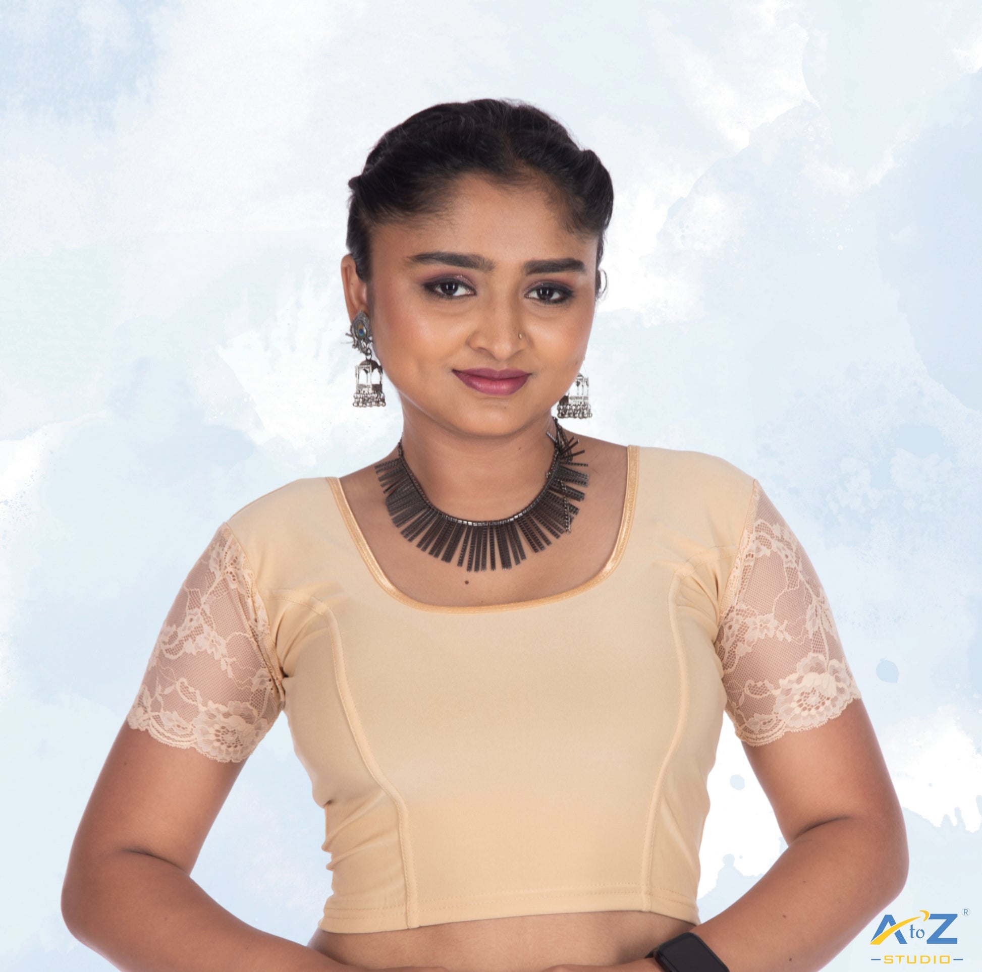 This Skin Polyester Lycra blouse features net short sleeves, a round neck, and an eye-catching plain and flower print in the sleeves, perfect for versatile styling.