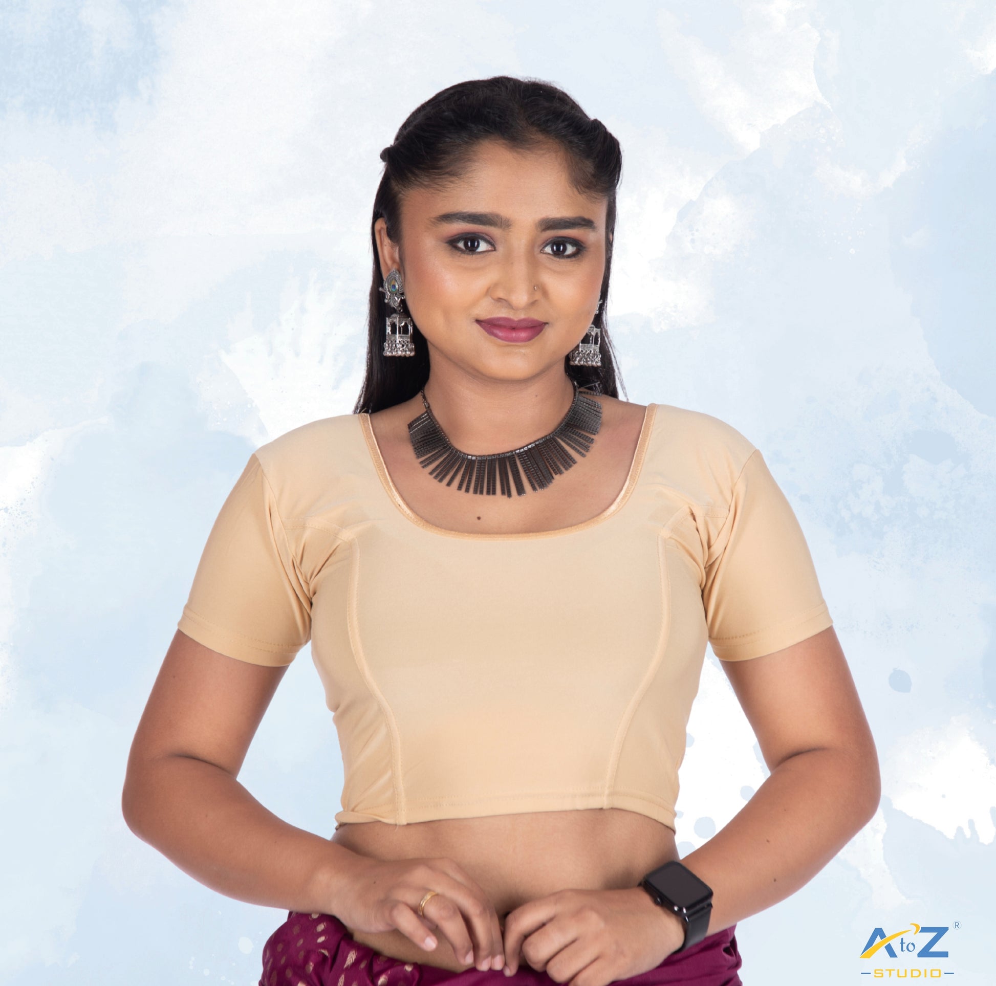 This Skin Polyester Lycra blouse offers short sleeves, a round neck, and a stylish, versatile plain design.