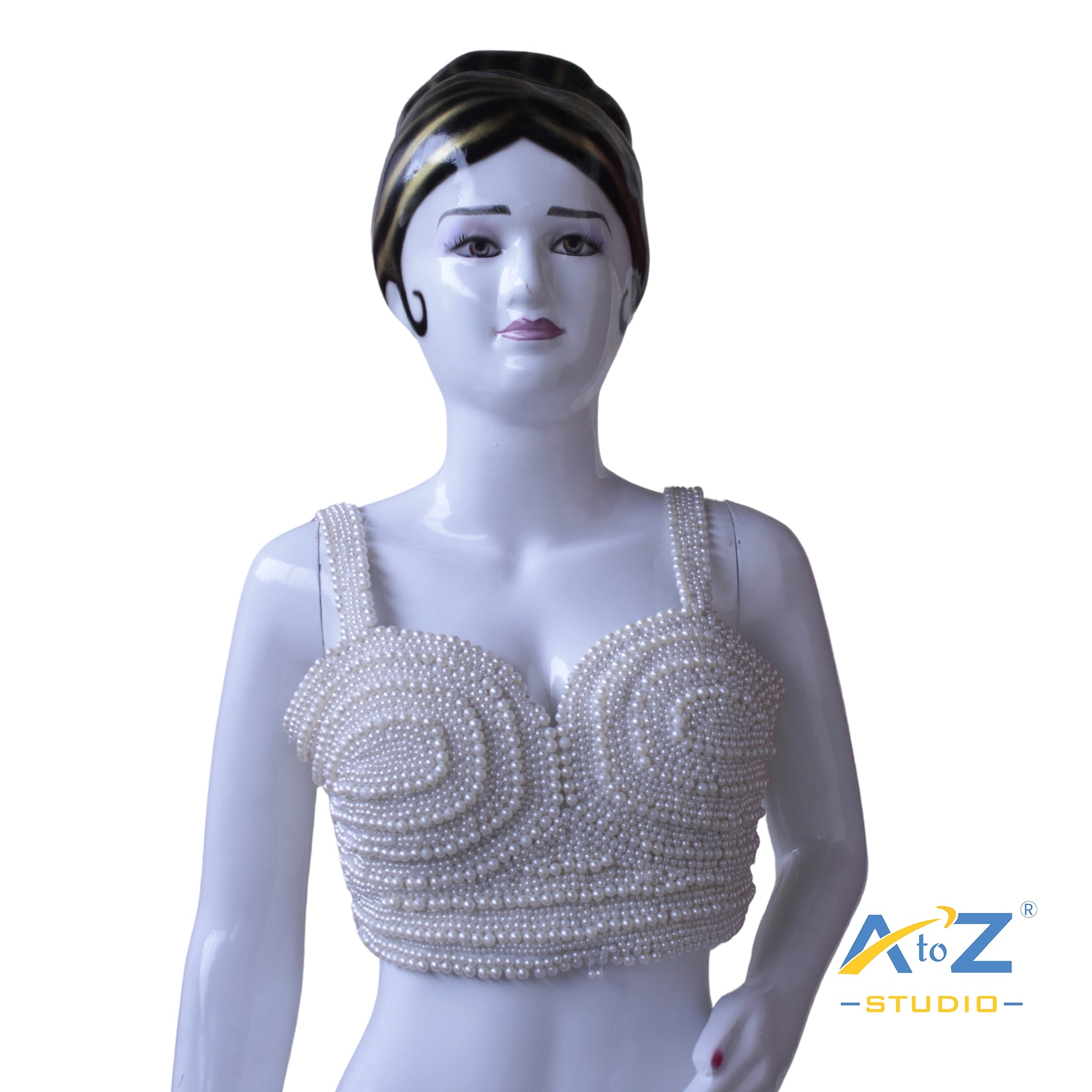 This heavily embellished blouse showcases layered pearls in circular and linear designs across a structured silhouette. With broader straps and well-defined cups, it provides more support and coverage. The design is chic yet comfortable, suitable for longer wear.