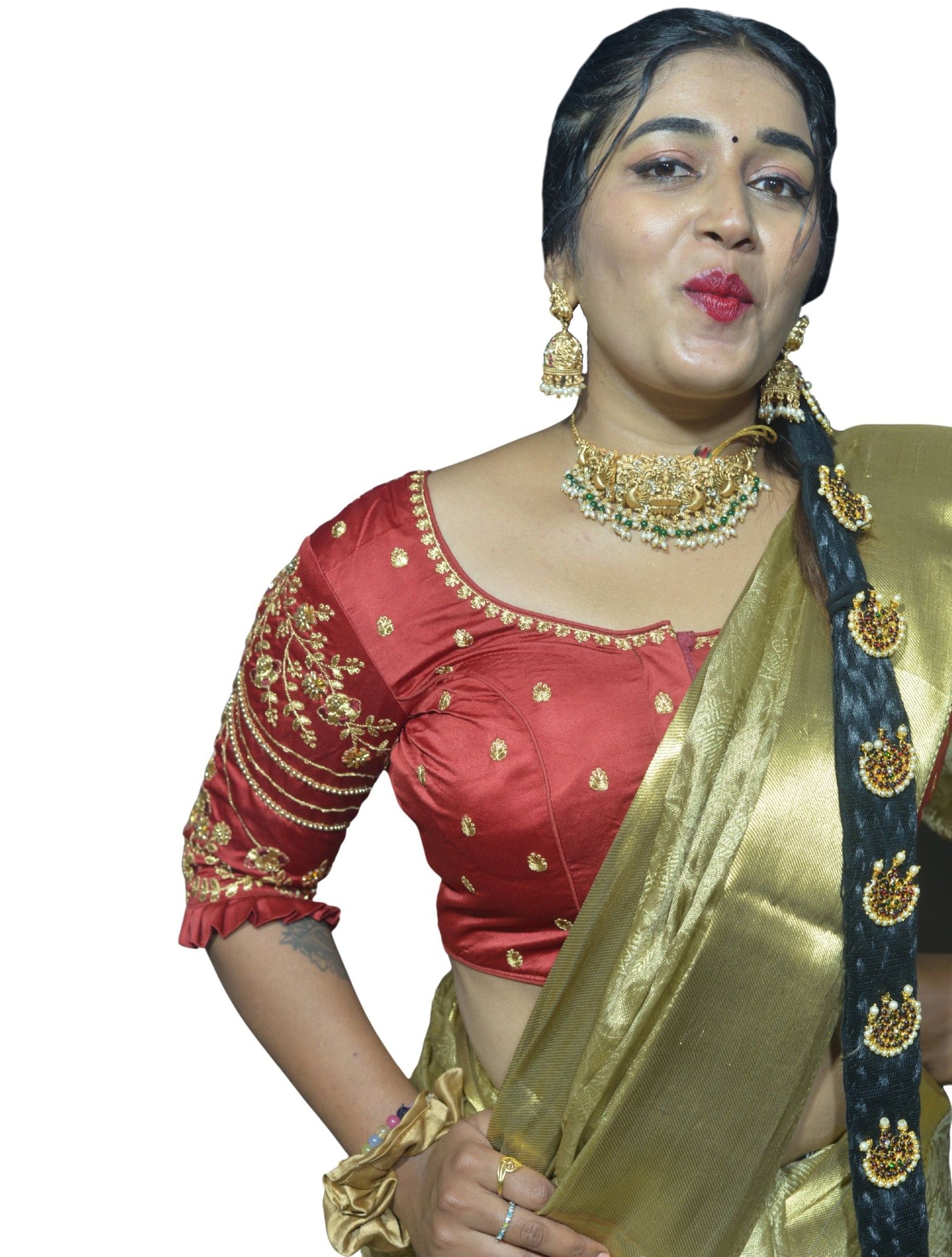Add a pop of color to your ethnic wardrobe with this Maroon blouse featuring multi-color thread floral embroidery, delicate frill endings on the sleeves, and a graceful chain pattern. A perfect mix of playful charm and refined craftsmanship.