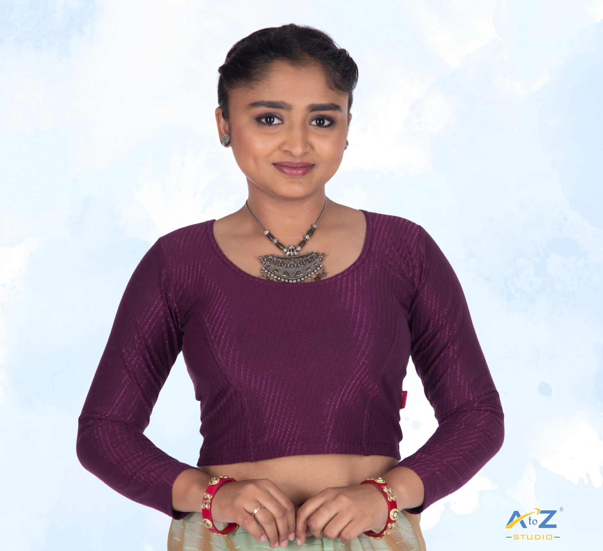 This Wine Cotton Lycra blouse is a perfect blend of style and comfort. Featuring 3/4th sleeves, a round neck, and a full-closed back with boat neck, its cross shiny lines exude subtle elegance.