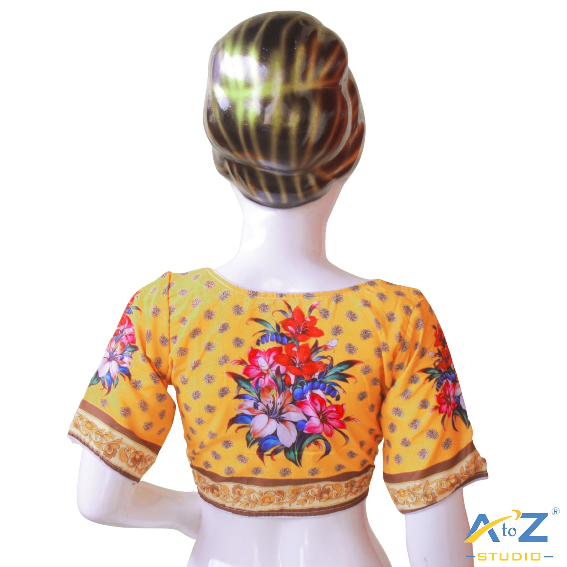 Featuring a rich navy backdrop, this blouse showcases vibrant bird and floral folk art motifs. The delicate borders and golden floral prints add a graceful ethnic charm.